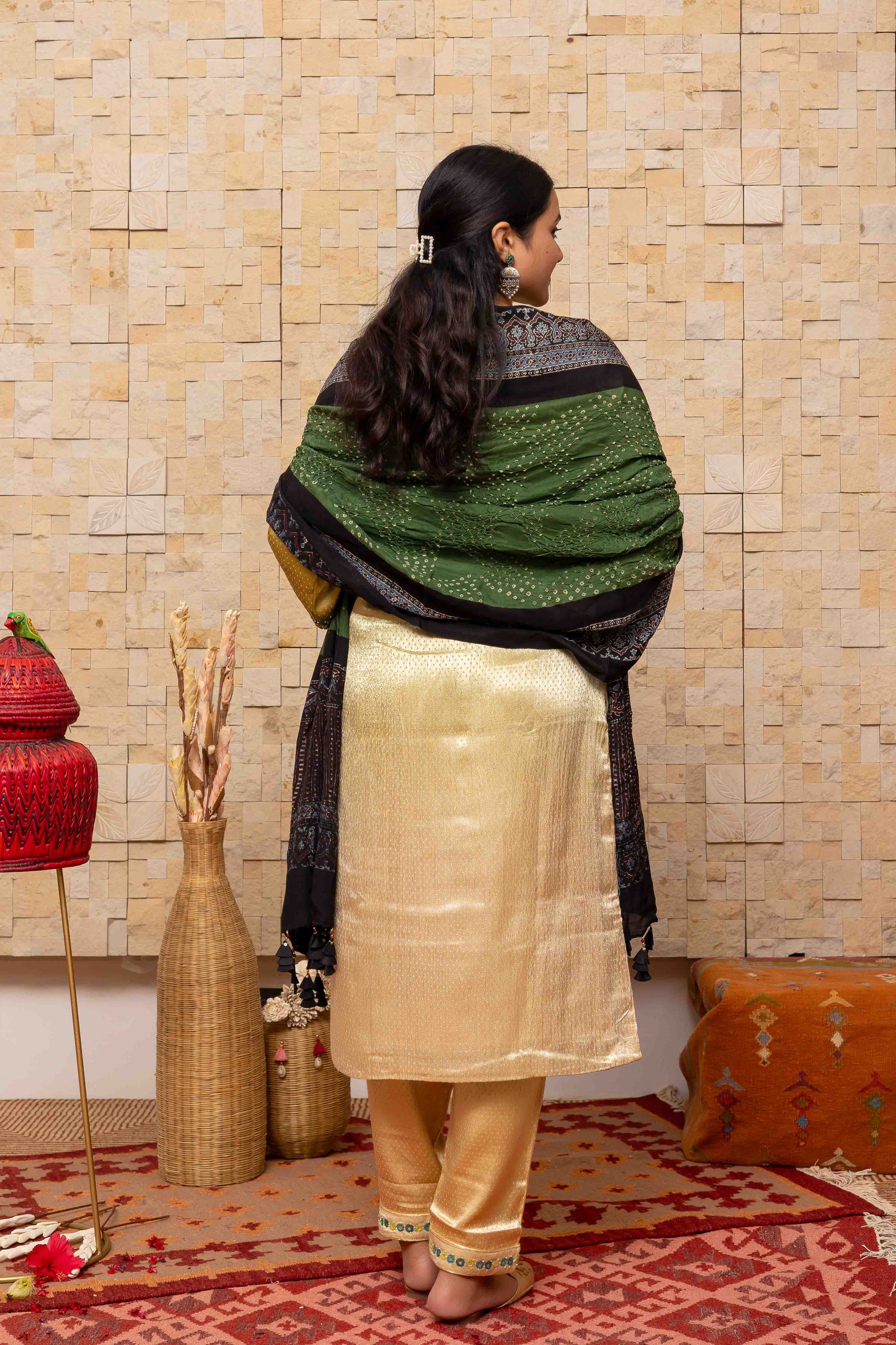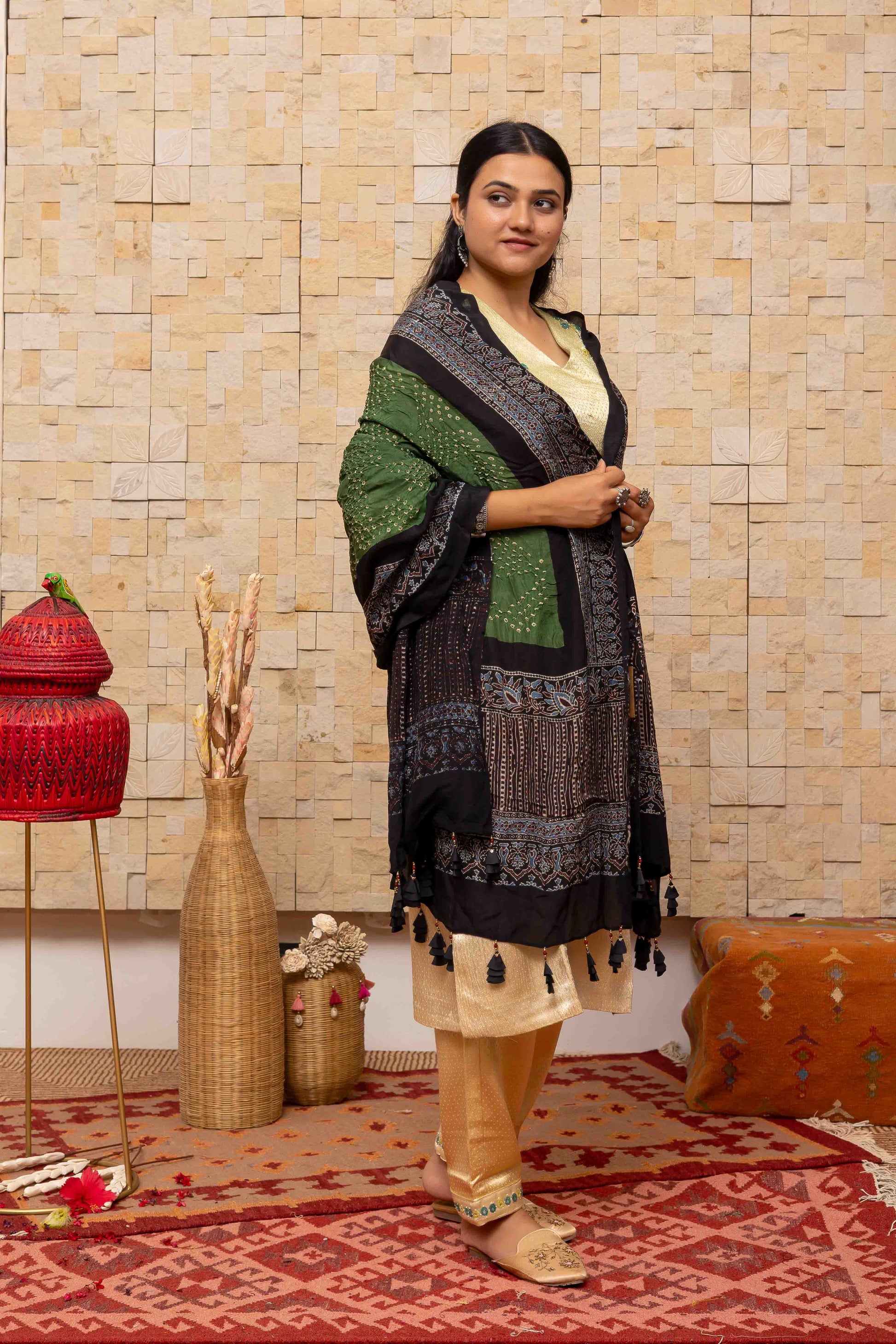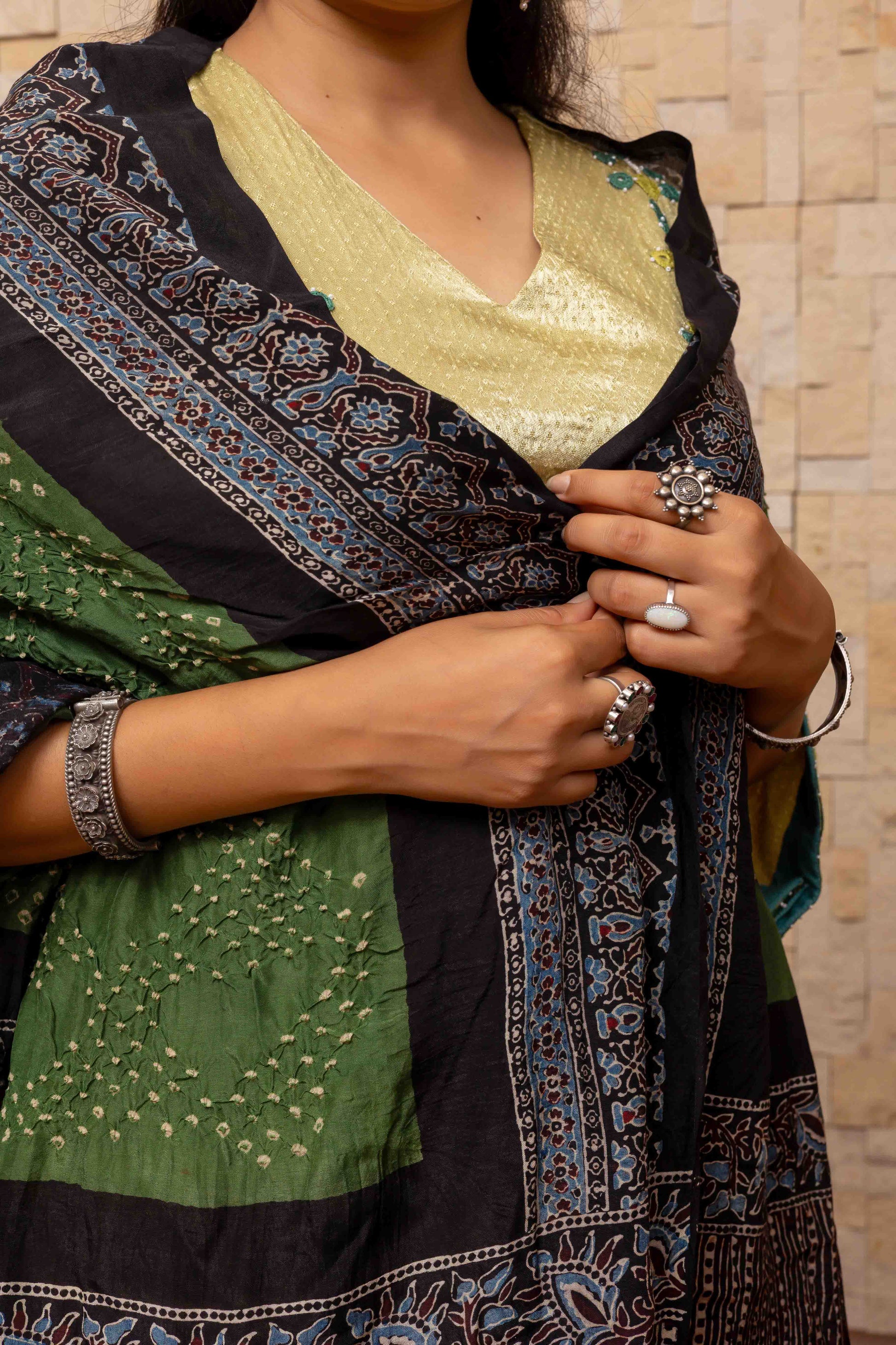 Rich and grounded; this forest green Ajrakh Bandhani dupatta is a soulful blend of Gujarat’s age-old textile crafts. Handcrafted on smooth; breathable modal fabric; it brings together the precision of Ajrakh block prints and the rhythmic detail of Bandhani tie-dye; each pattern created by skilled artisans using natural dyes and traditional methods.