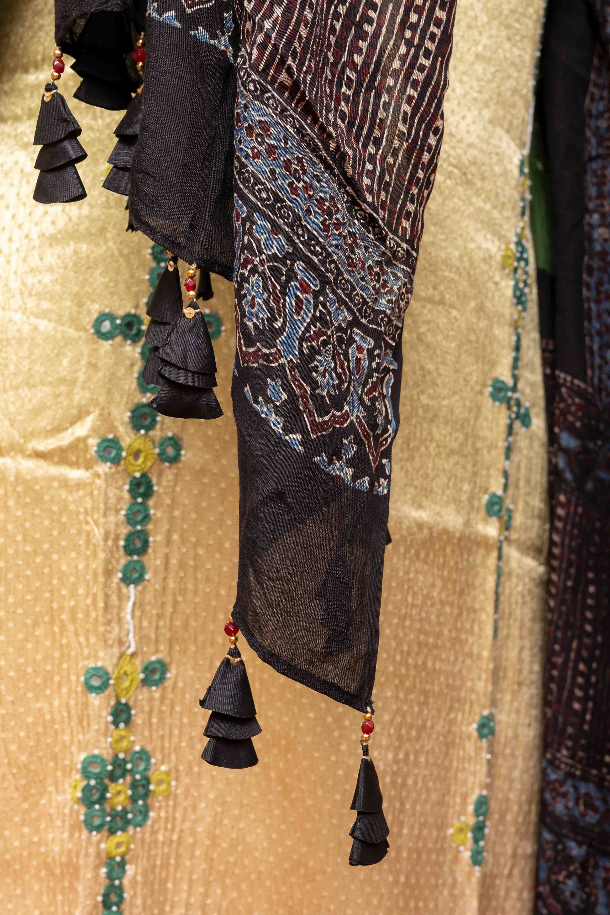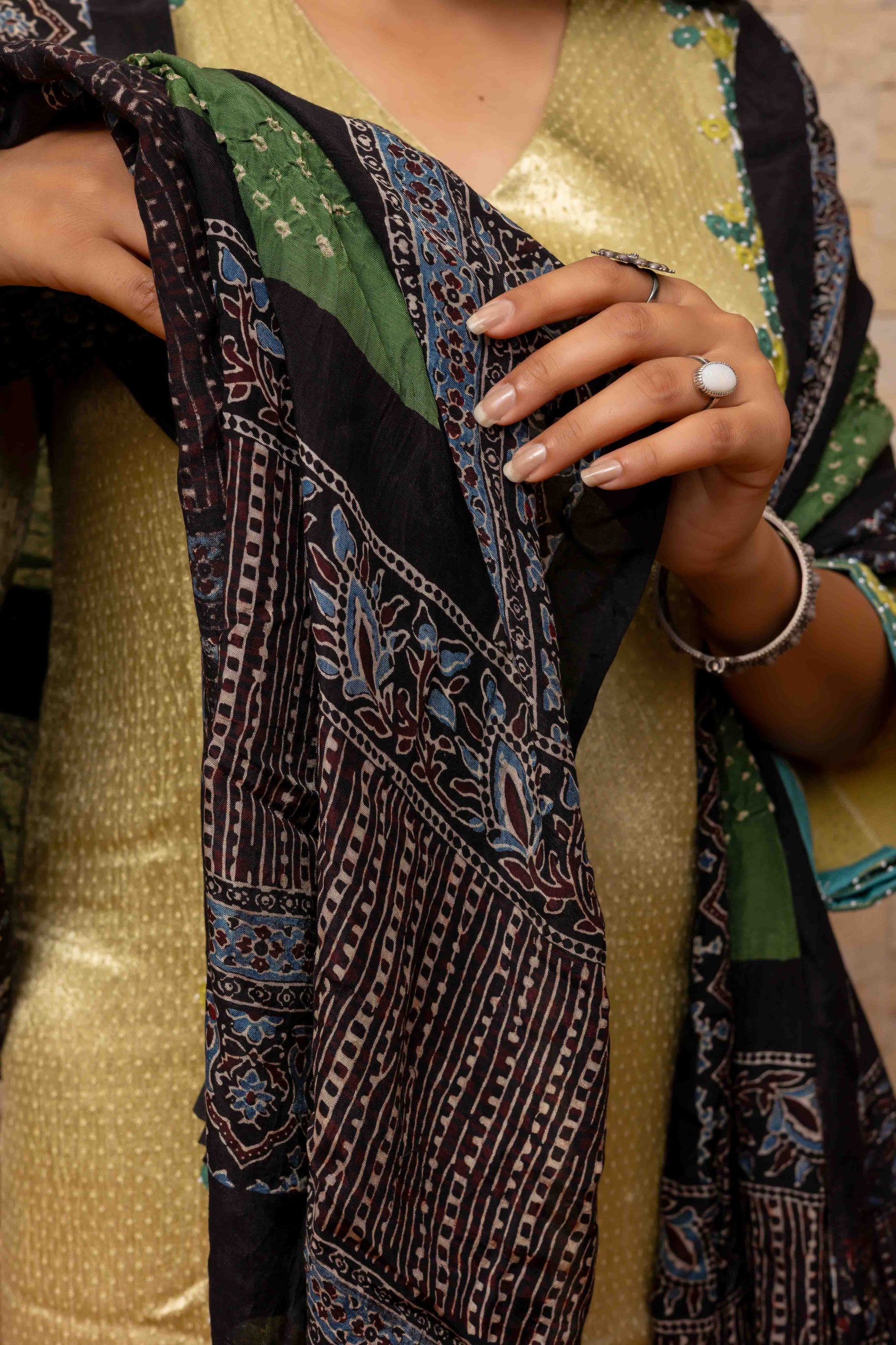 Olive Green Ajrakh Bandhani Dupatta With Handmade Tassels