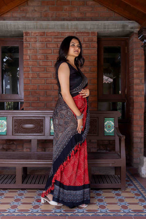Ajrakh Bandhani Modal Saree with Tassels: Orange