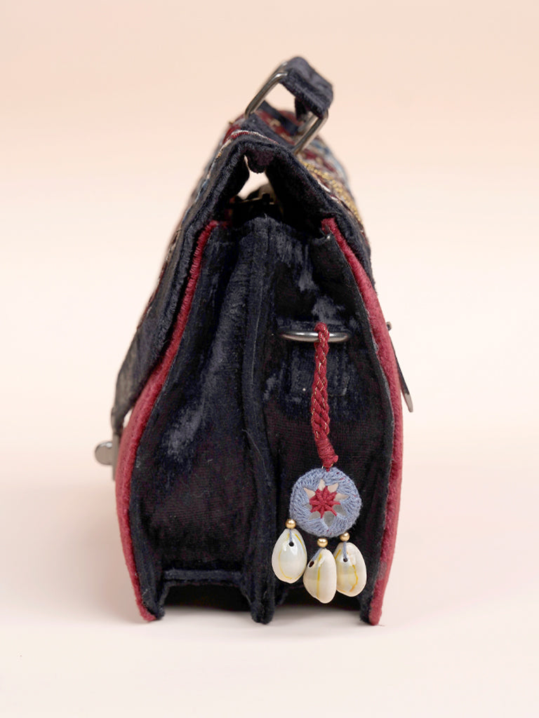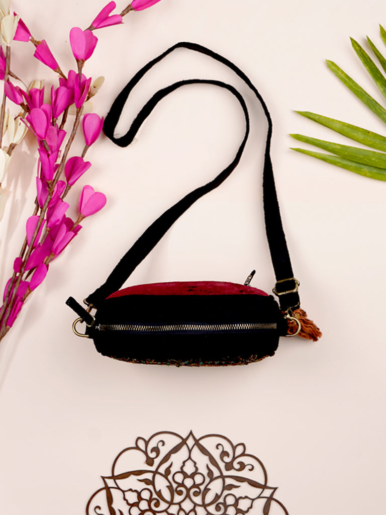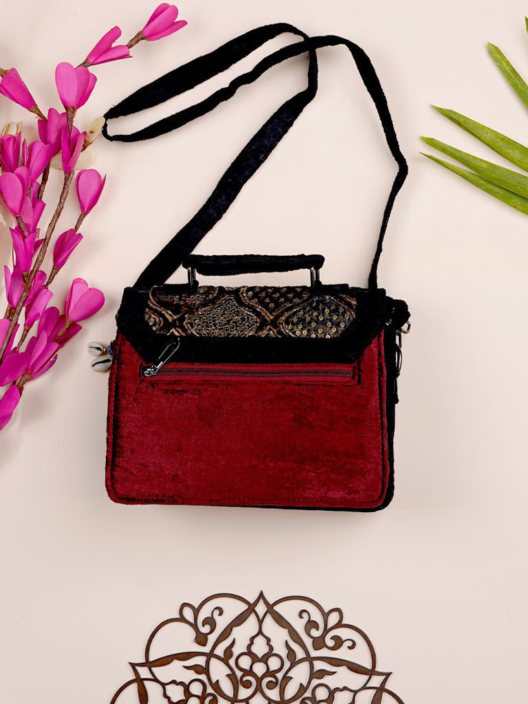 Admire the classic charm of ajrakh with a Zardosi flap sling bag handcrafted by our artisans with love and finesse. This maroon ajrakh sling bag has the minute detailing of supreme threads, fabric, and zari work. It is done with attention to detail by our artisans to elevate its luxurious feel. The crafts used on this exclusive bag is ajrakh, Khat, and handwork with utmost precision. These crafts witnessed on the bag belongs to the origin of Gujarat. The handcrafted sling bag is the epitome of our artisans' skills and dedication. It is a versatile bag for every women to add to their fashion ensemble. Size: 12 X 4 X 10 wash care: Dry clean. Shop for a good cause to support artisans.