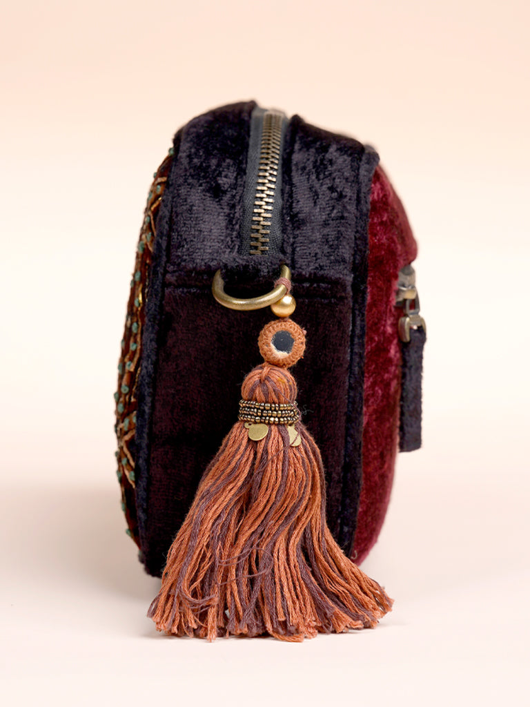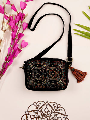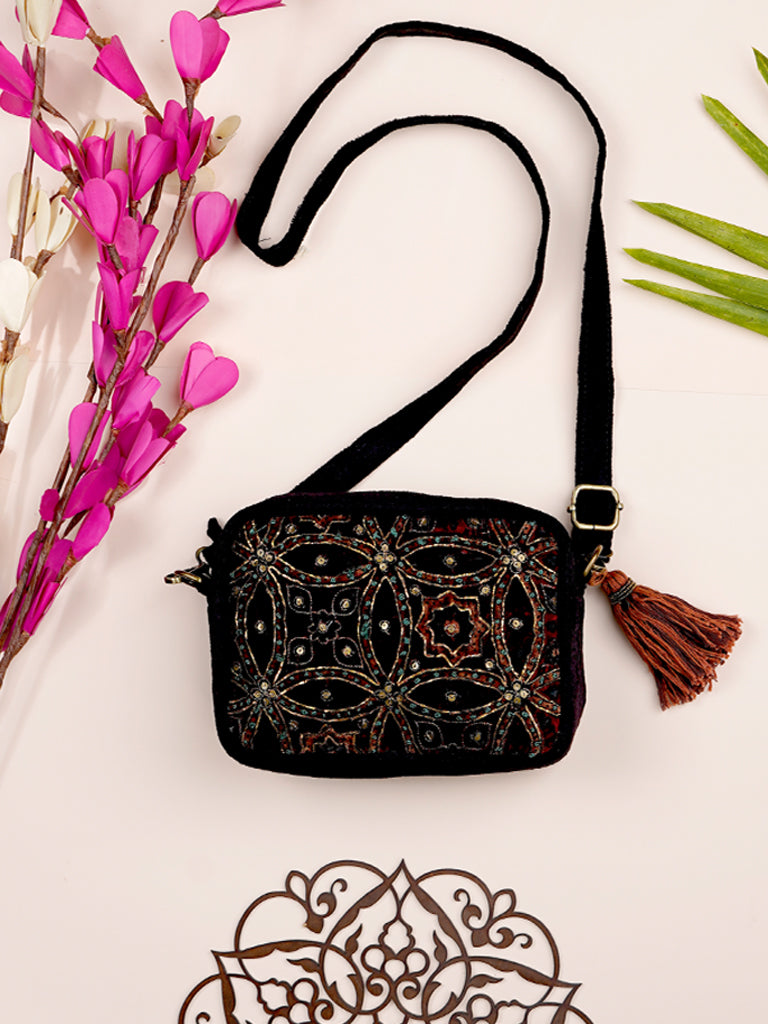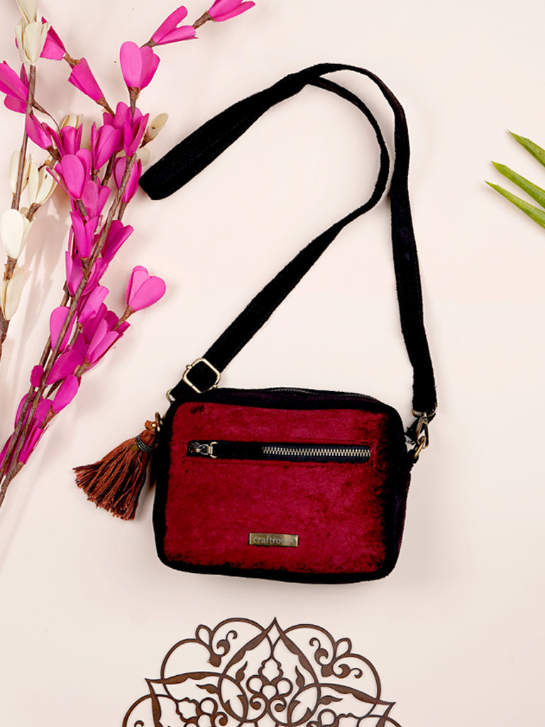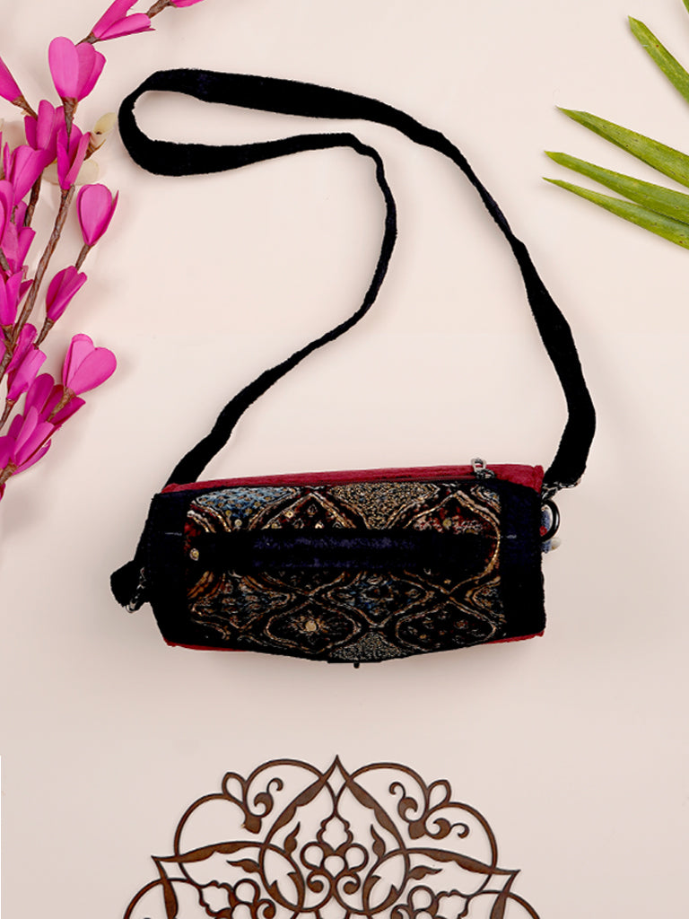 Invest in the ultra beautiful Ajrakh Zardosi Sling bag to add charm to your styling ensemble. Respect the magnificence of khat, Ajrakh, and handwork embellished by our skilled artisans to give an adorable look. The creative fine hand-embroidered traditional needlework of zardosi elevates the royalty of the maroon sling bag. It is designed to give an elite charm with ultimate fine styling for your extraordinary events. The Indian crafts and techniques adorned on this classic bag belong to the region of Gujarat. Handcrafted with devotion and utmost refinement by our talented artisans. This stunning Ajrakh bag imbibes a powerful heritage of Indian craftsmanship. The highest quality of soft threads, fabric, and zari is used to design this circular bag. Surely, it is the best piece to give to your loved friends and sisters.