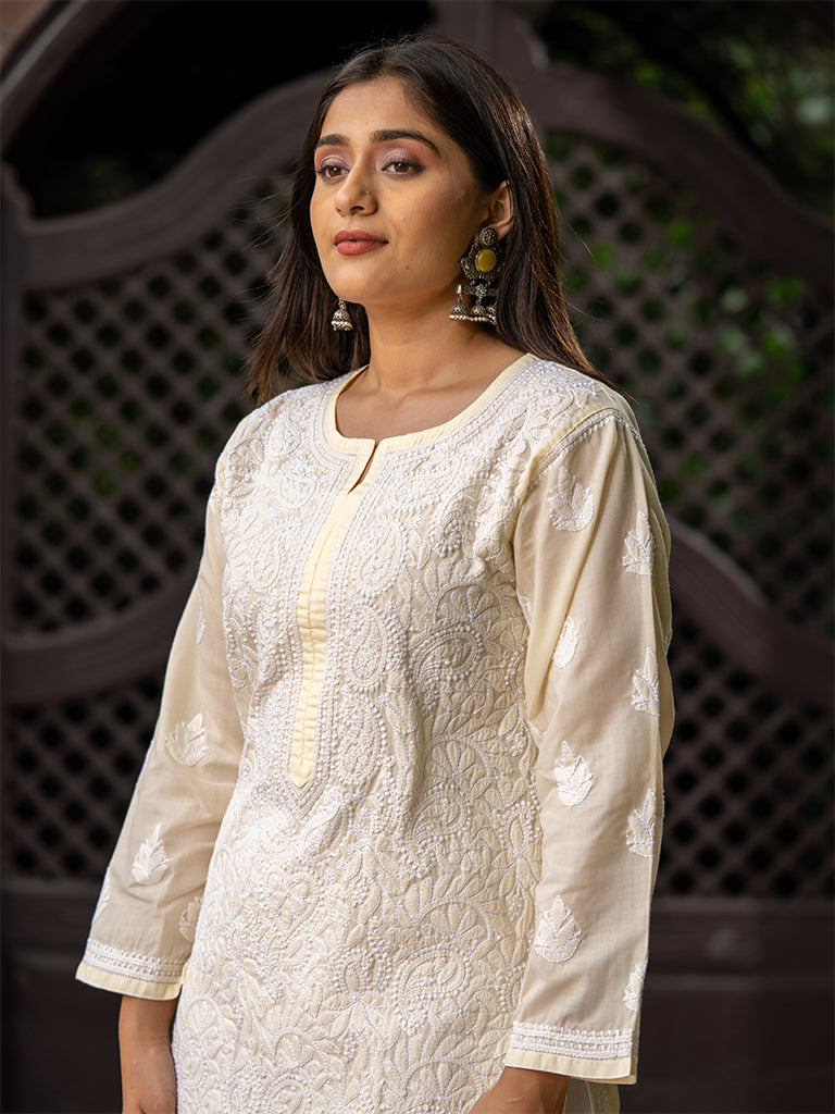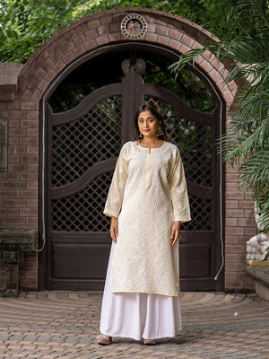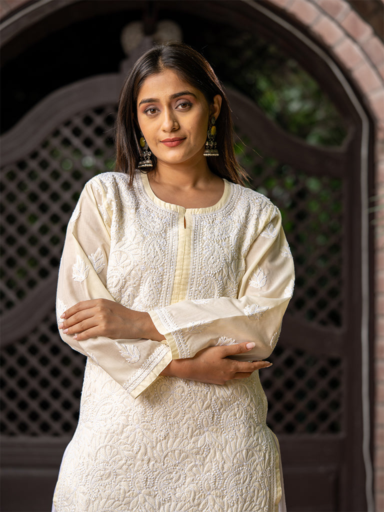 Explore the all-over Chikankari embroidered kurta with gorgeous motifs and a beautiful yoke. This Chikankari long kurta will be an amazing pick for your special days.