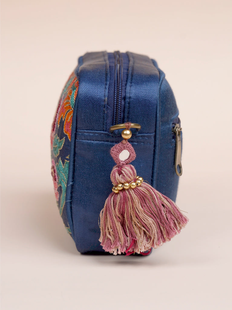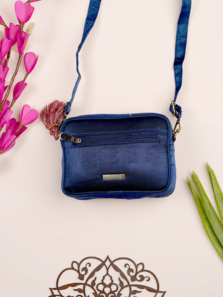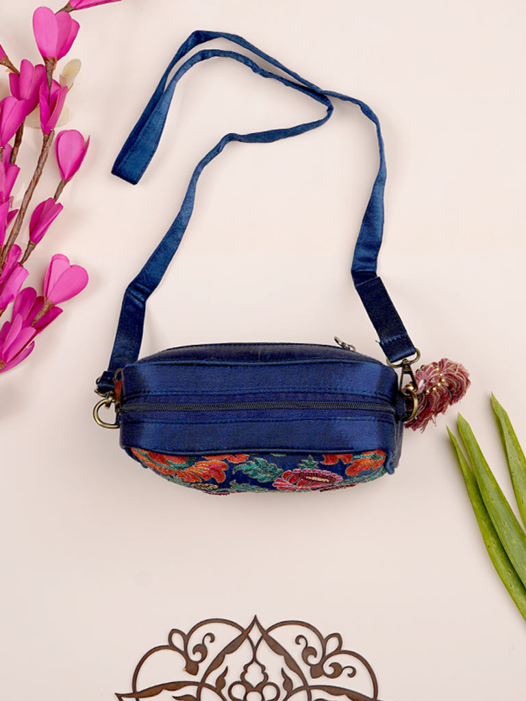 The blue blooming flower sling bag is the epitome of artisans’ craftsmanship. We are bringing you the most authentic handcrafted sling bag with gorgeous detailing embedded. The minute intricacies of khat and handwork create a symphony of blooming flowers in beautiful colours. The highest quality of threads, fabric, and zari is used to make this bag. Also, there is a handmade tassel attached with the belt to uplift the appearance. Every thread used is of the finest quality and it is a perfect pick to style for your special parties. Surely, An essential element to add to your fashion ensemble. Handmade with love and devotion by our artisans. The crafts witnessed on this bag belongs to the region of Gujarat. Size: 5 x 8 x 2.5