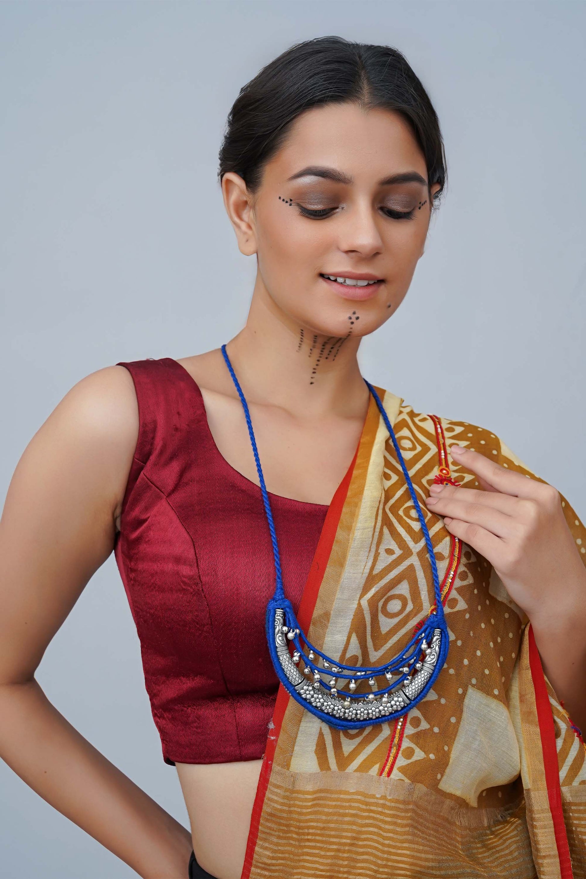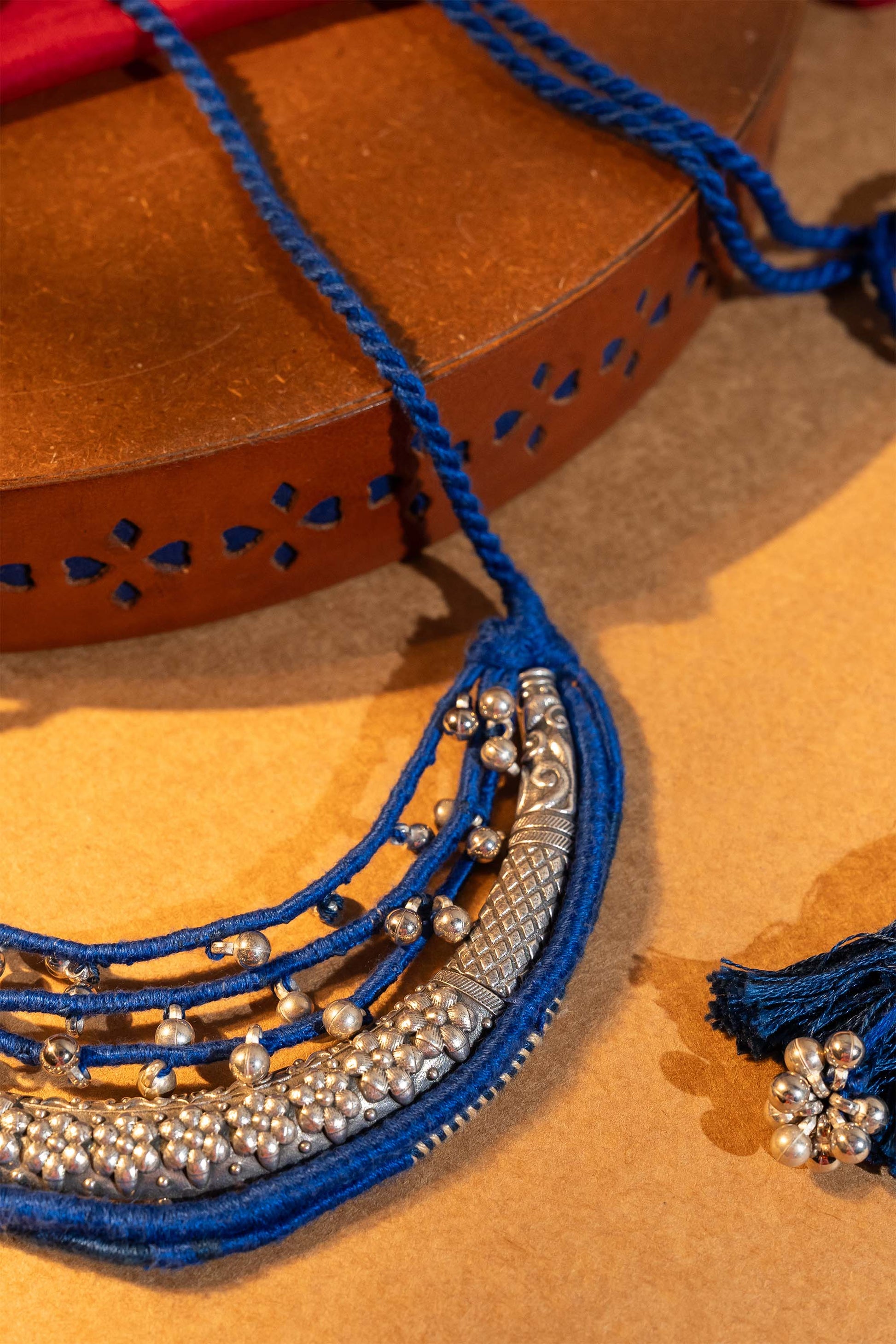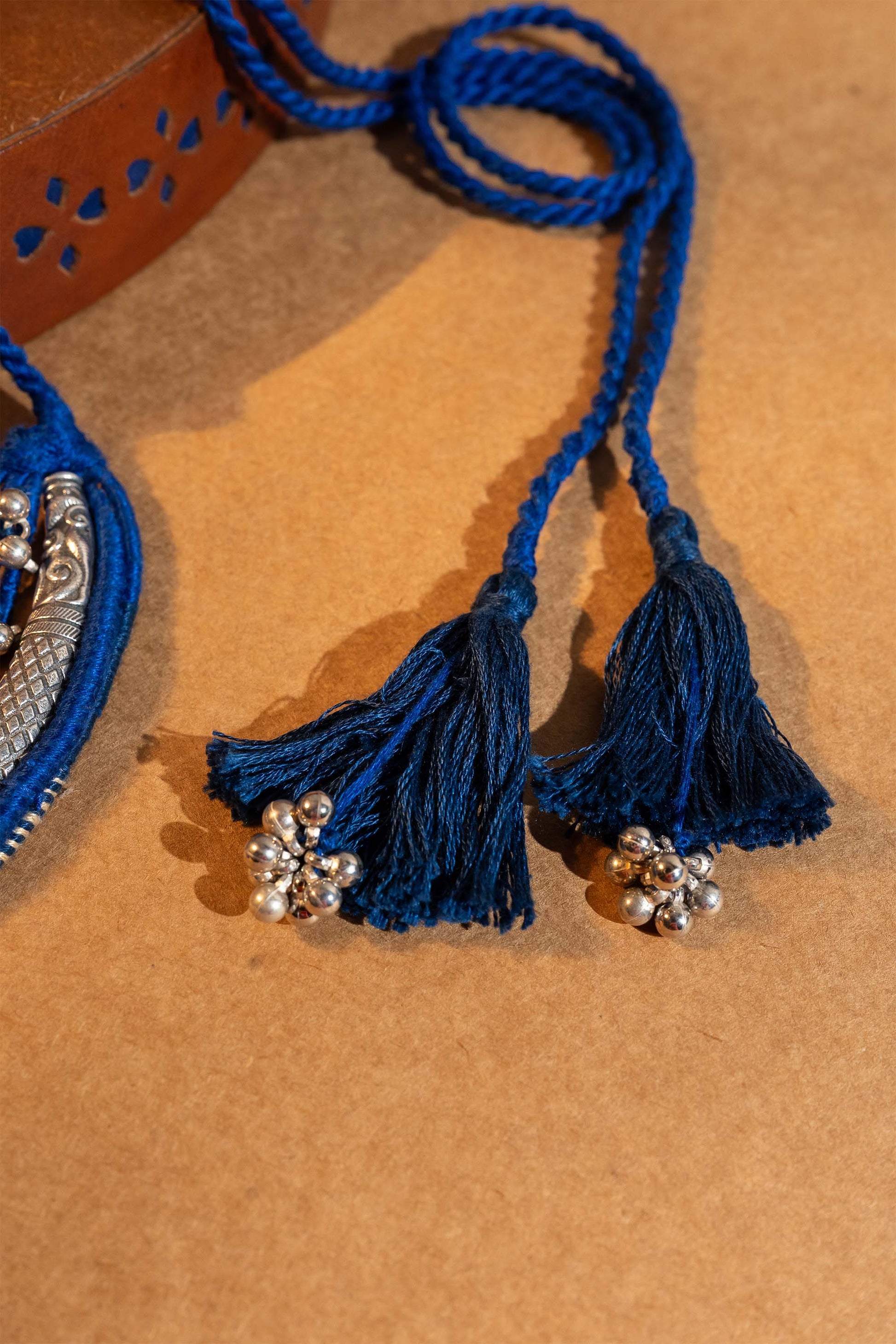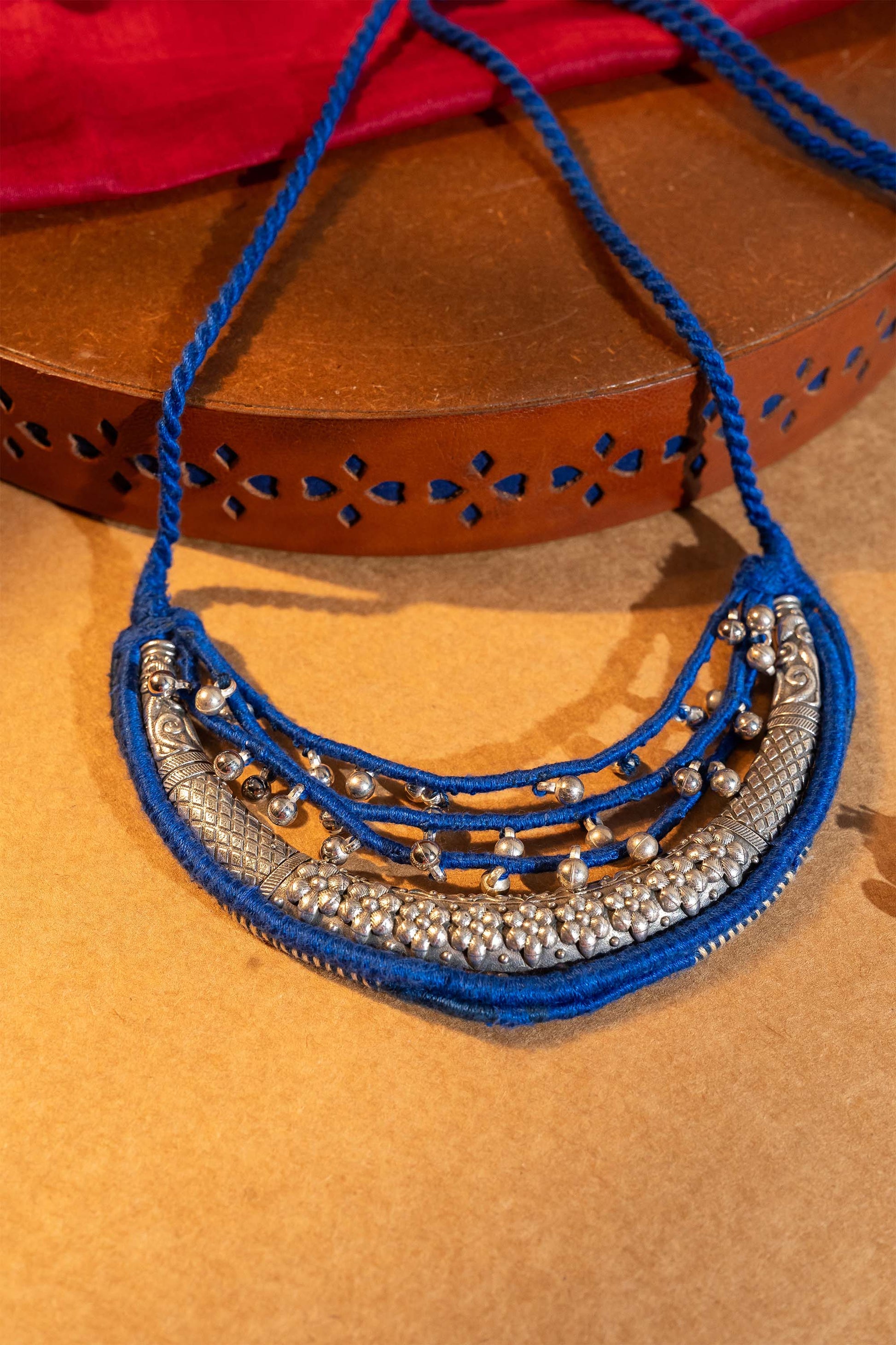 Make a chic statement with our Blue Half Moon Necklace, handcrafted with intricate metal handwork and detailed with fine thread artistry. Designed with a sturdy cord for comfort, this necklace showcases a bold half-moon pendant highlighted in vibrant blue. The fusion of traditional craftsmanship with a modern silhouette makes it perfect for festive occasions, cultural gatherings, or adding an artisanal edge to everyday wear. Lightweight yet striking, it reflects the timeless beauty of handcrafted jewelry.
