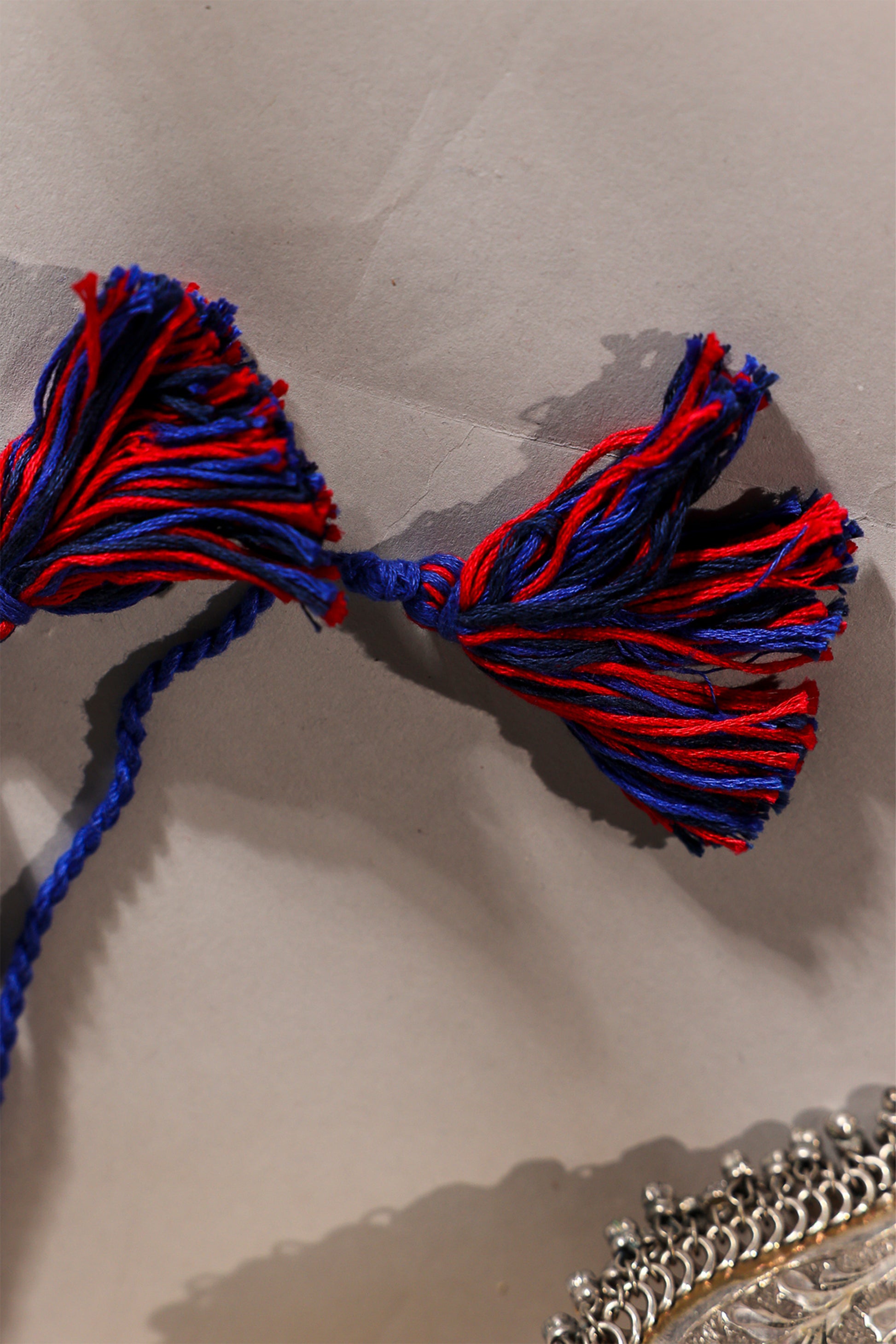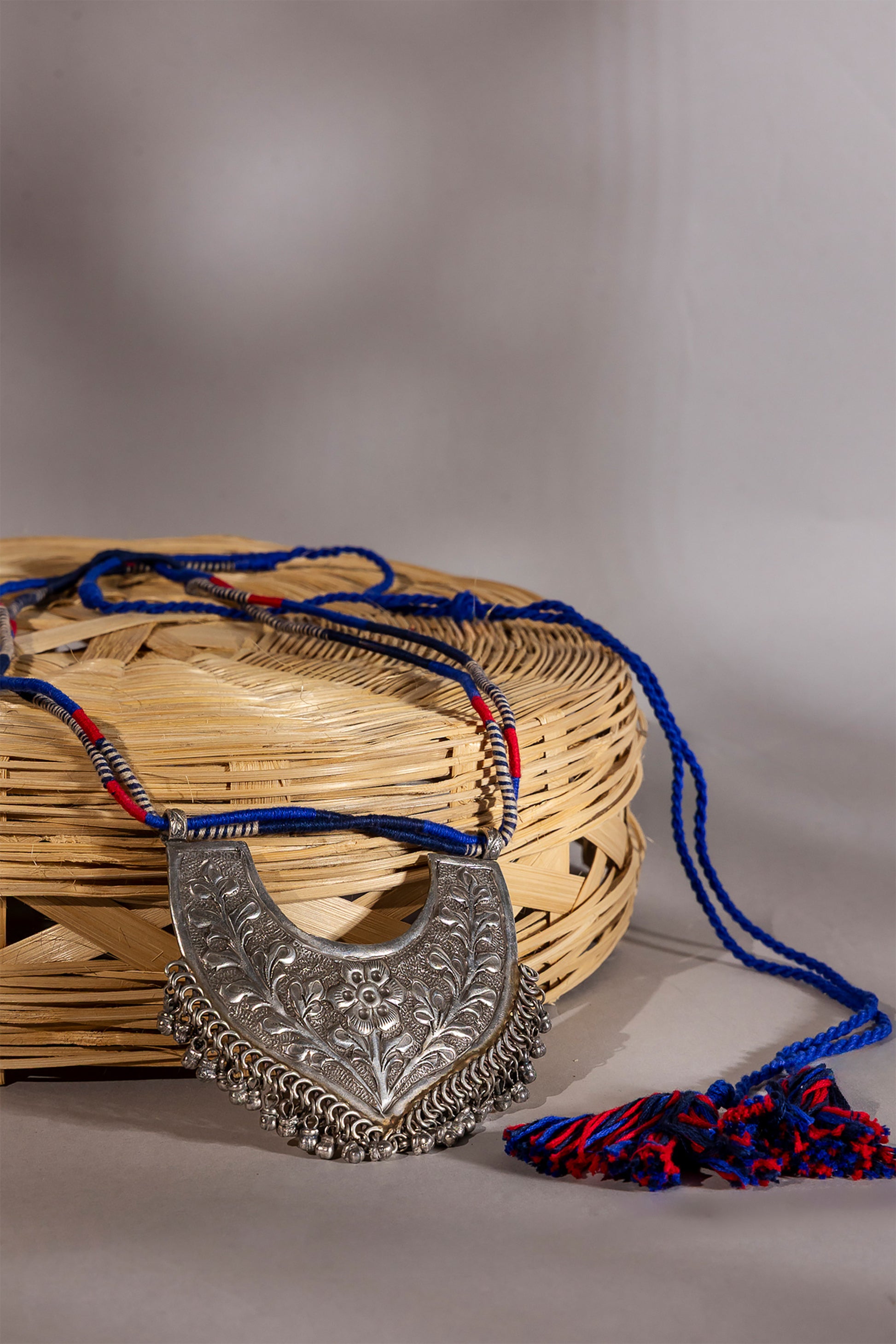 Make a striking statement with this elegant Blue Long Oxidised Pendant, a perfect fusion of traditional craftsmanship and contemporary design. Carefully handcrafted using metal, thread, and cord, it features intricate metal detailing and fine handwork, reflecting the skill and artistry of skilled artisans.