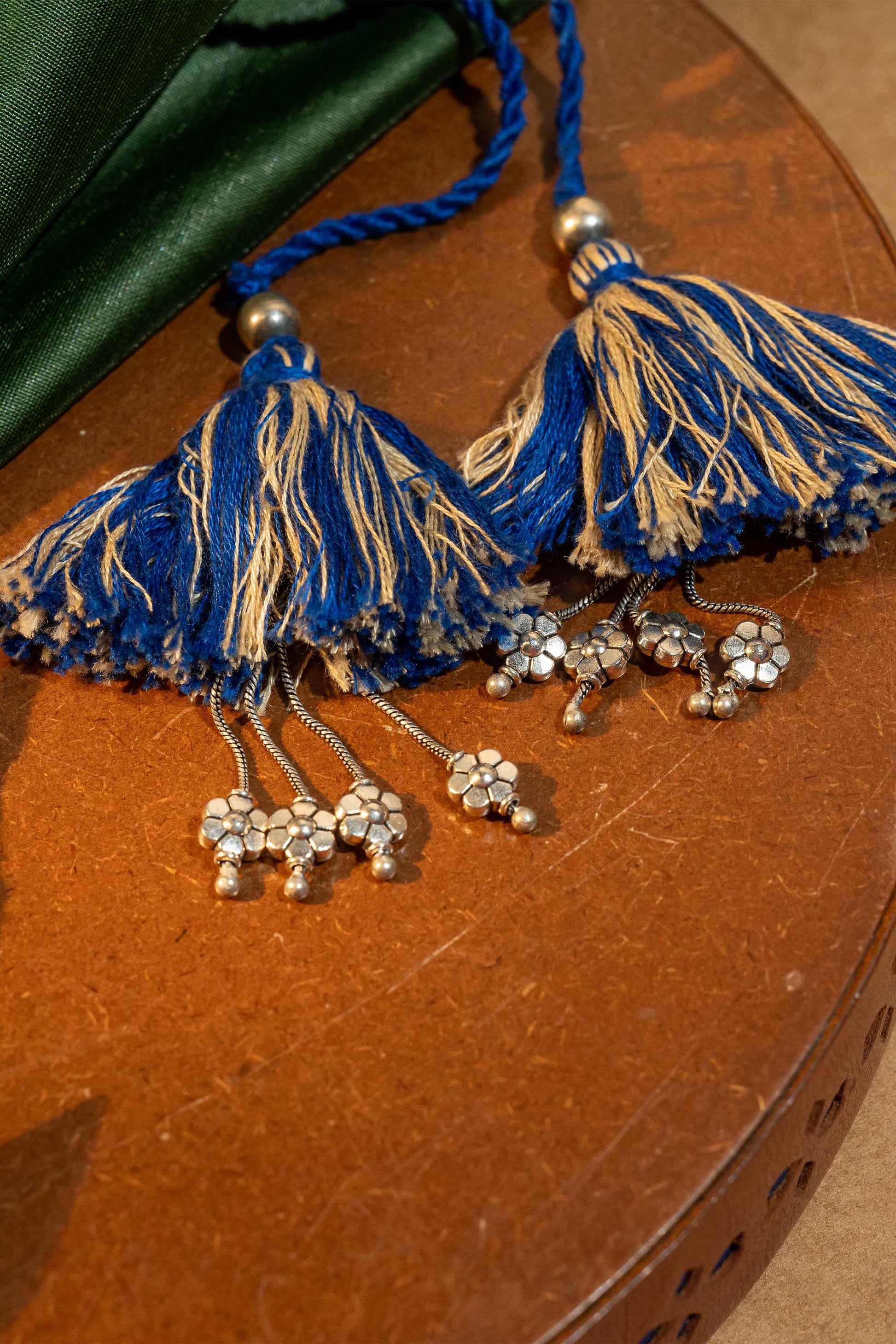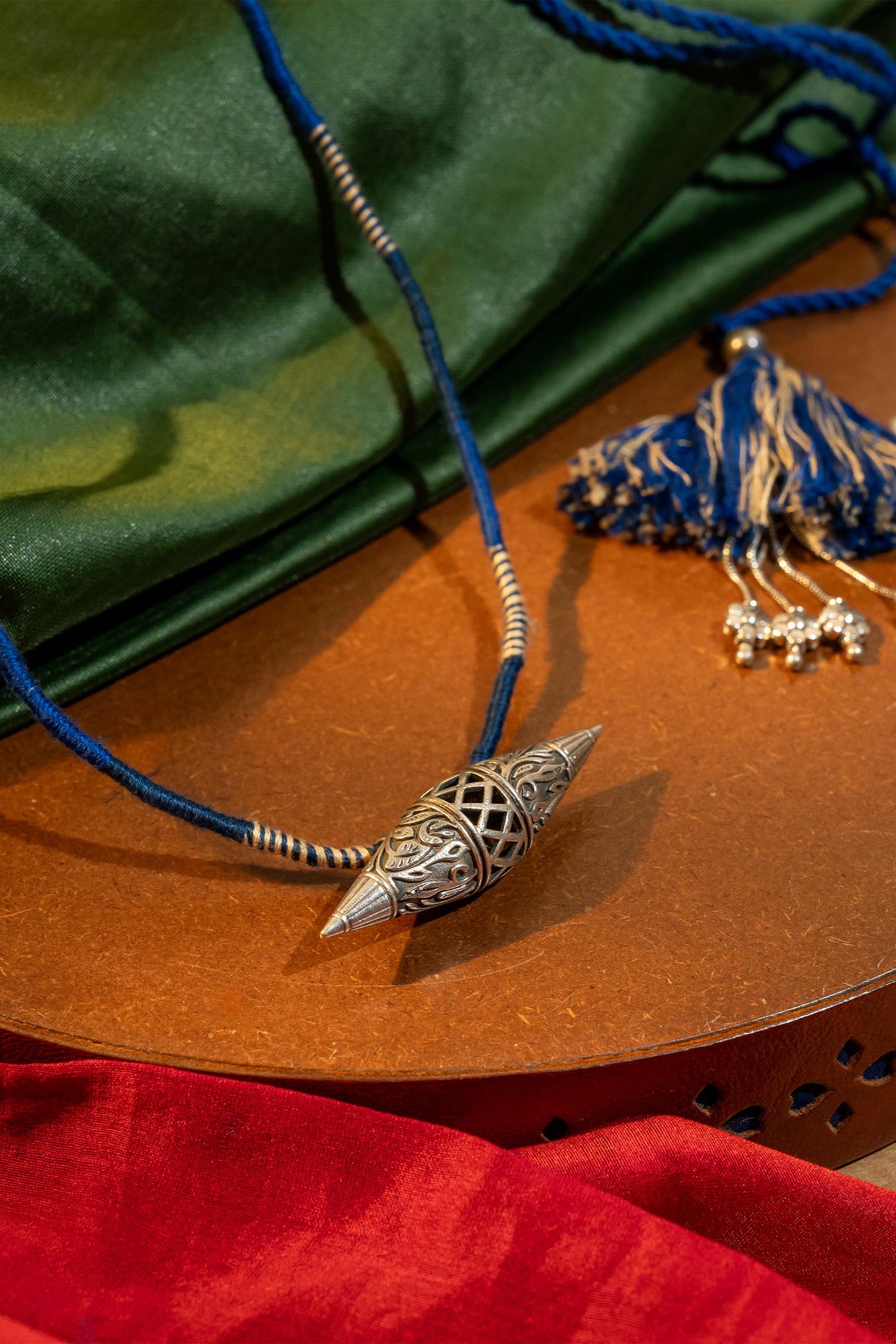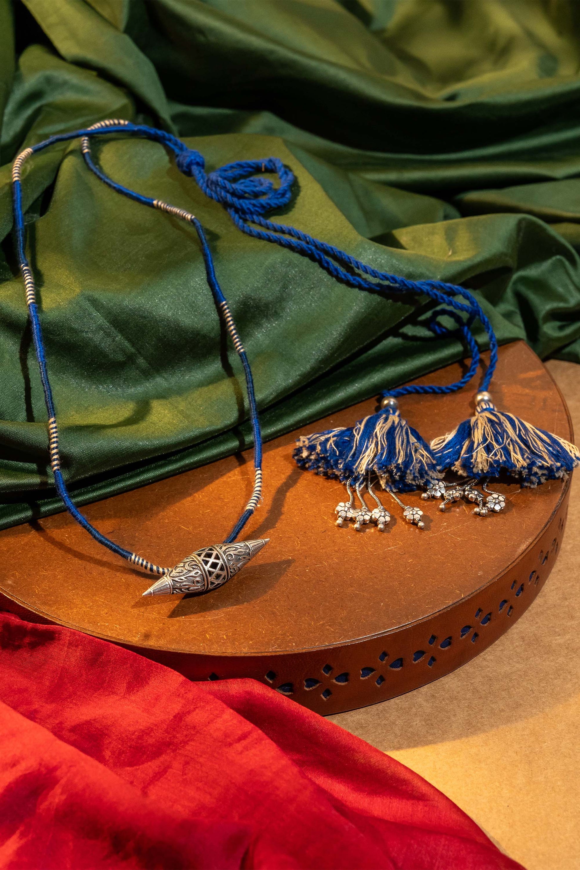 Elevate your style with the Blue Madaliyu Pendant, a stunning blend of tradition and contemporary charm. Handcrafted with care, it features soft cotton threads, durable cord, and oxidised metal detailing that captures artisanal finesse. Each piece is carefully made by Craftroots artisans, reflecting heritage, skill, and soulful artistry. Perfect for oxidise jewelry lovers, this pendant adds a bold yet elegant touch to your fashion ensemble. Pair it with festive or casual outfits for a statement look that celebrates handmade luxury.