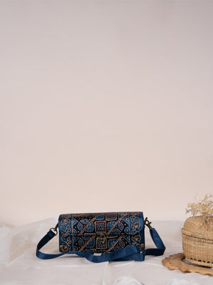 The Ajrakh blue square wooden sling bag is a beautiful item made from special mashru fabric. It adds a nice touch to any outfit. This light beige bag is carefully made by our talented artisans who use exquisite aari hand embroidery and ajrakh hand block printing. It has a robust base made of MDF and a strap that you can take off, making it both useful and fashionable. This bag shows the rich tradition of crafts from Gujarat, blending old designs with modern fashion.