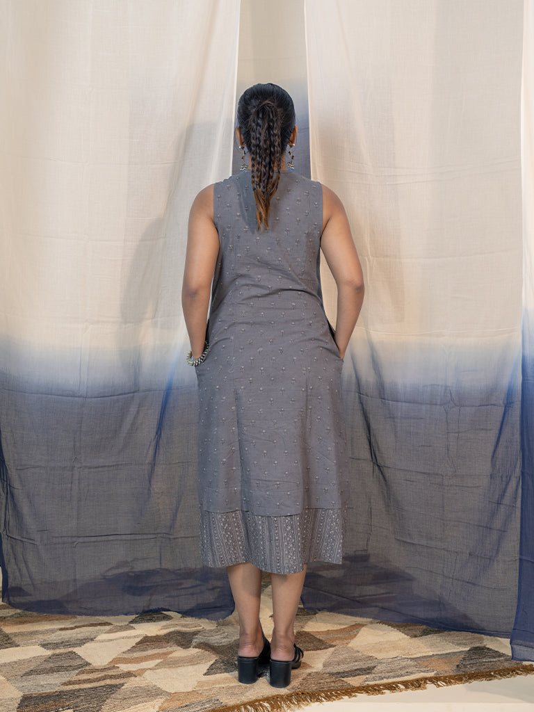 The gorgeous dress with block print presents the beautiful essence of the daily ensemble. This button-down dress is grey and made of the purest cotton fabric to make you feel comfortable.