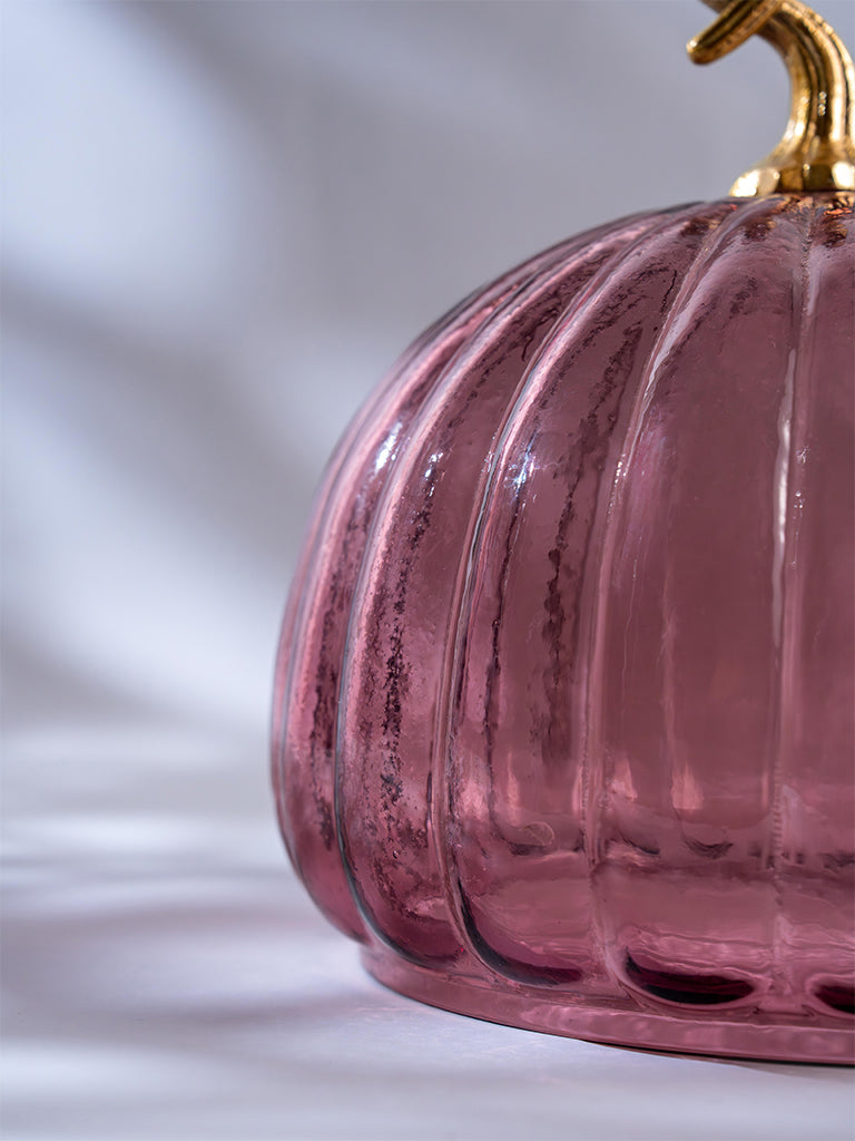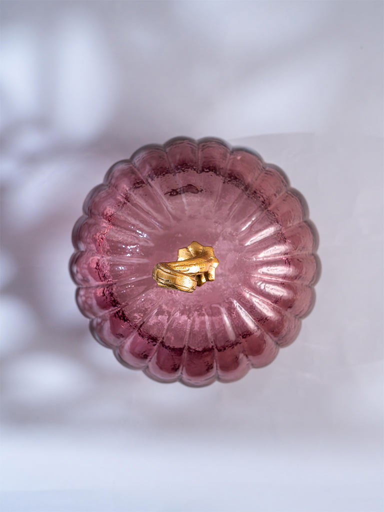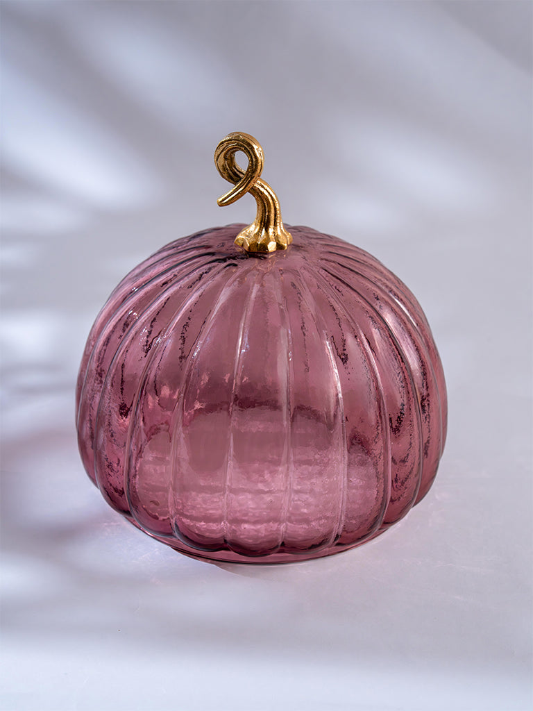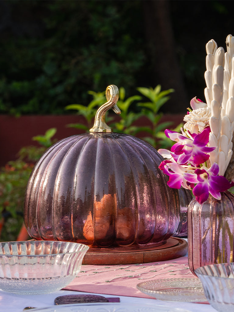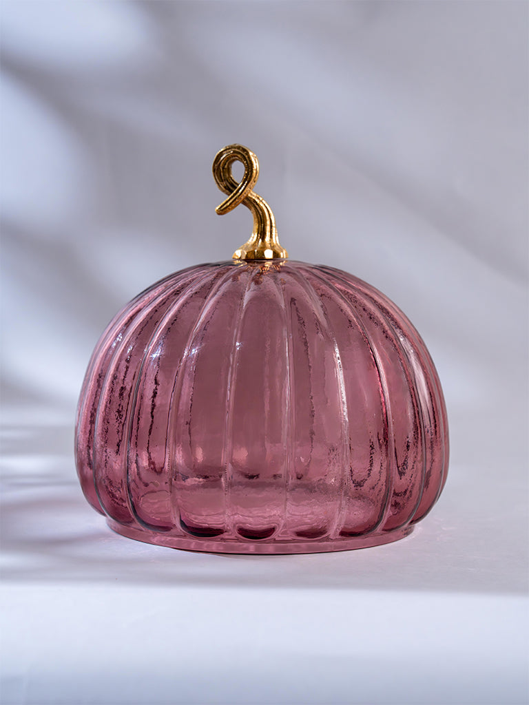 Cover your delights with this exuberant Mauve Glass Cake Dome. In a quirky design of a lustrous pumpkin, hand-blown by our master craftsmen with molten atristry and excellent precision. A craft reaching your kitchen counters and dinner tables from the land of Firozabad, UP.