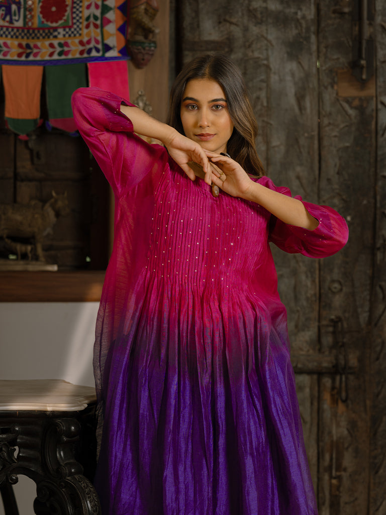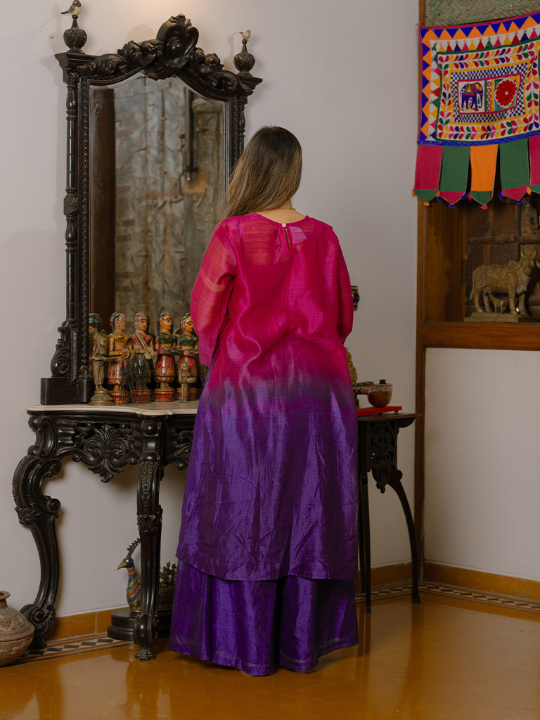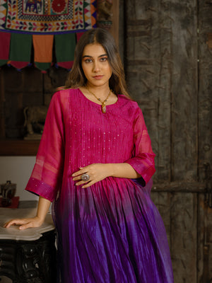 Immerse yourself in the splendid beauty of a pink & violet kurta embellished with intricate badla handwork. Made from elegant chanderi silk, they offer a gentle feel against your skin. Enhance your special occasions with these stunning gradient festive kurtas.