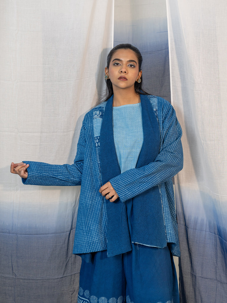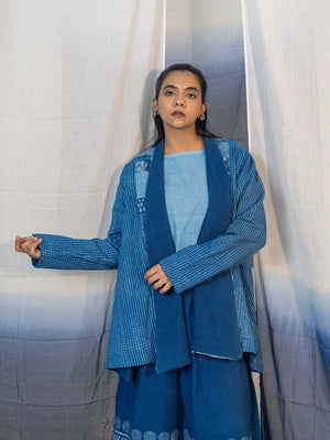Embrace the checkered patchwork jacket is made out of the finest cotton fabric. The gorgeous amalgamation of modest patches accentuates its block prints on it. A multi-purpose blue exclusive jacket designed for your special rendezvous.