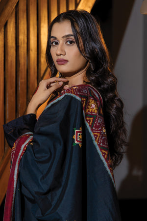Where depth meets detail, this Black Cotton Patola Dupatta from Gramshree Luxury becomes a canvas of living tradition. Crafted from soft, breathable cotton, it drapes with ease while offering everyday comfort. Adorned with authentic Rabari hand embroidery, the dupatta features Sadubharat stitchwork accented with delicate mirror embellishments. Hand-finished tassels add movement and a celebratory charm to the silhouette. The bold black base beautifully enhances the vibrancy of the embroidery, making it versatile yet striking. Thoughtfully handcrafted, each piece carries subtle variations that honour the artisan’s hand. Perfect for festive occasions, cultural gatherings, or refined everyday styling.