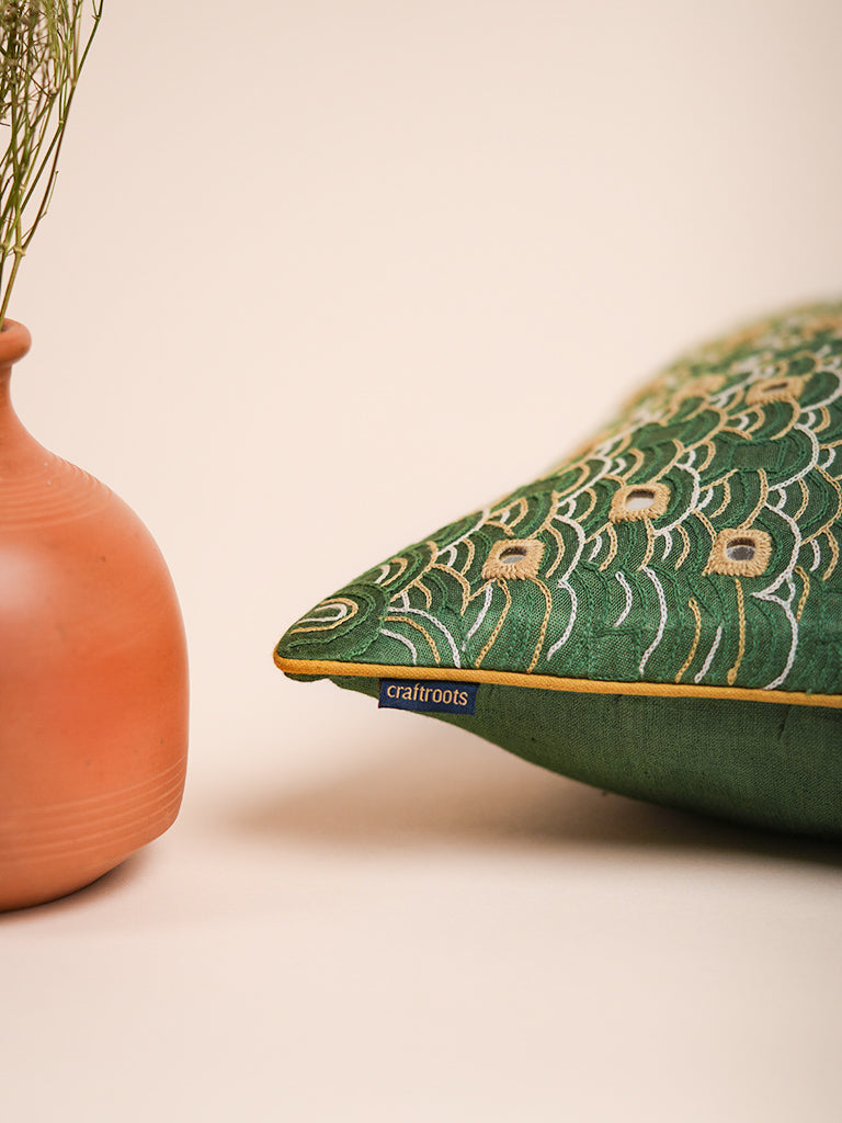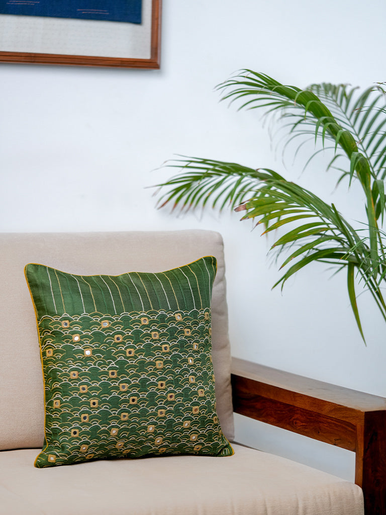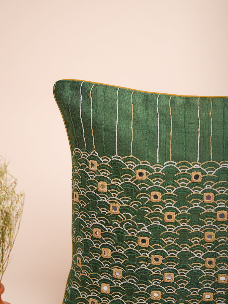 #CUS994AAAA14323Adorn your home decor with this beautiful hand-embroidered cushion cover. Expertly crafted with intricate mirror work and attention to detail, this cushion cover adds a touch of elegance to any space. Please note, dry cleaning is compulsory for maintaining its beauty.