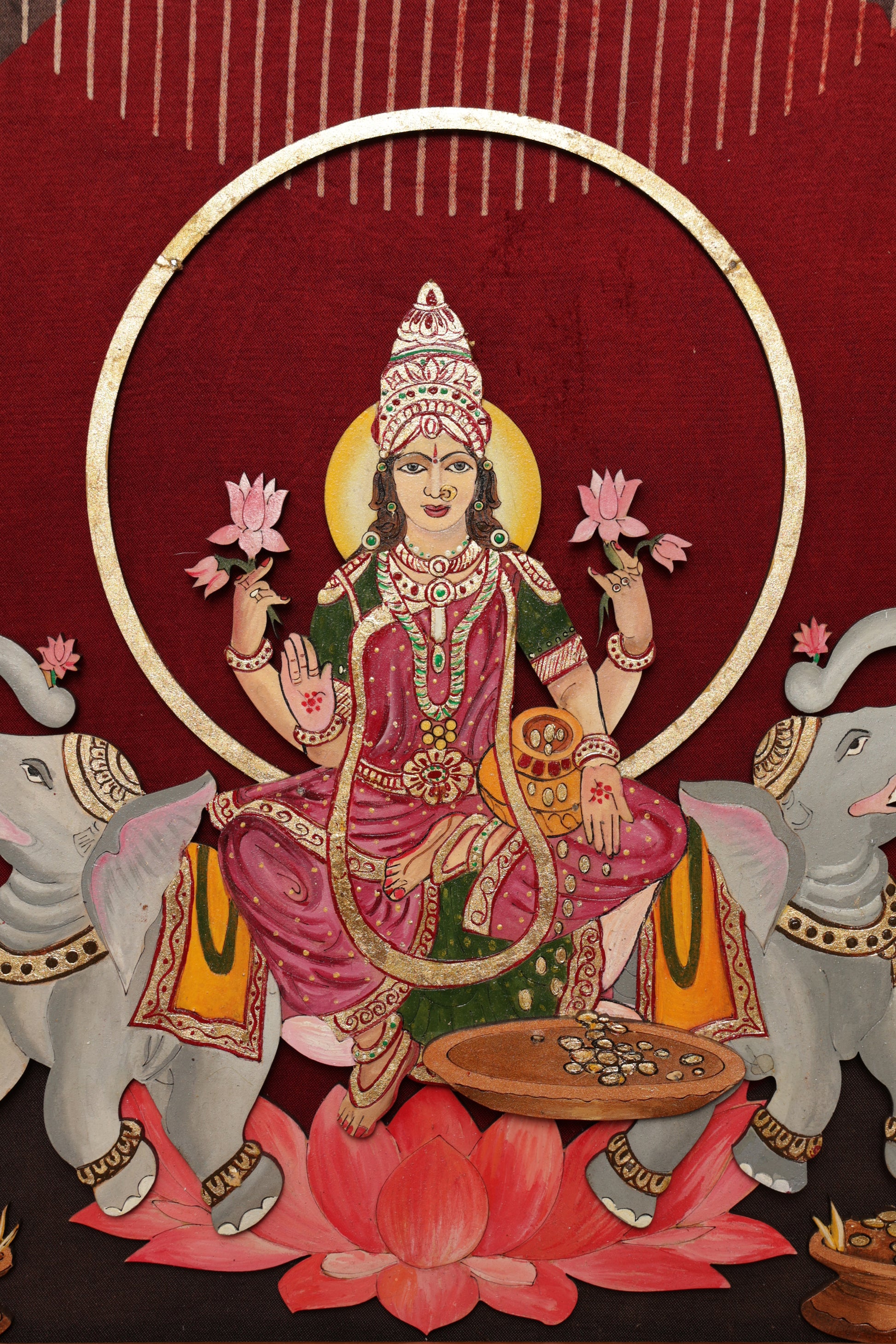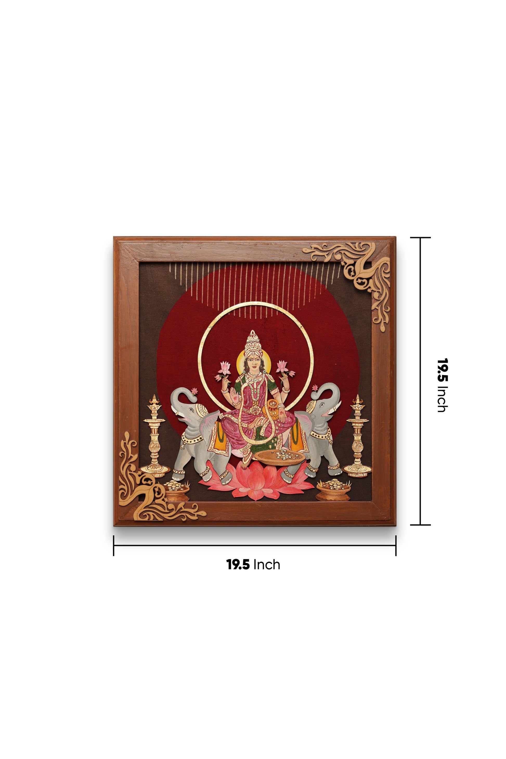 Bring prosperity and grace to your home with this Dhanlakshmi wall frame, handcrafted in Ahmedabad. Featuring red and grey hues on premium fabric, the artwork is enhanced with intricate gold foil painting that adds a radiant touch. This mythological frame beautifully captures the essence of wealth, abundance, and devotion, making it a perfect piece for home decor or gifting. Created with care by skilled artisans, it celebrates traditional craftsmanship and spiritual symbolism. To maintain its elegance, avoid direct sunlight and clean gently with a blower.
