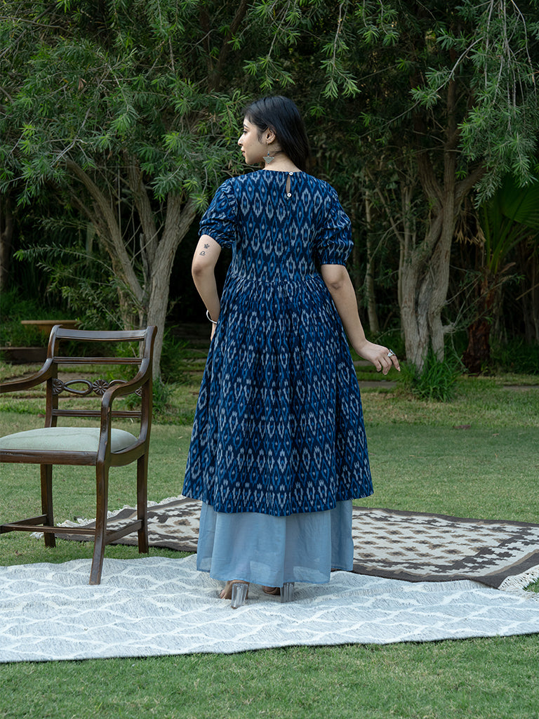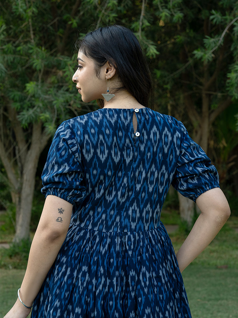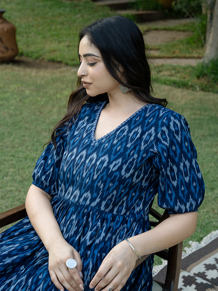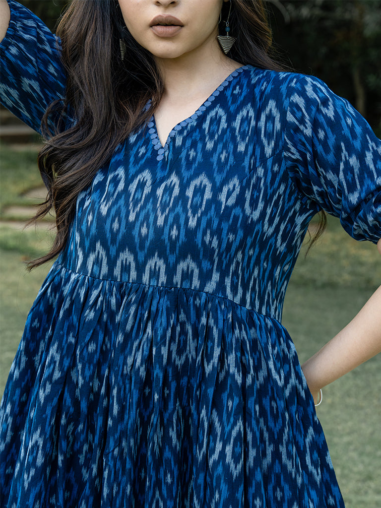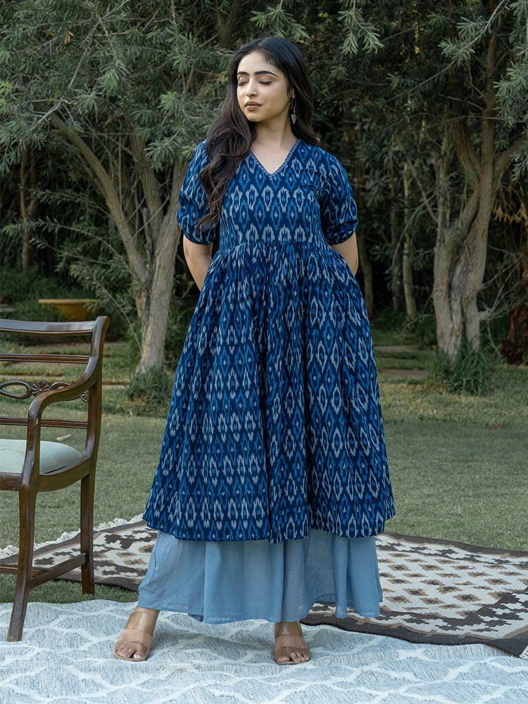 A double-layered Ikat dress is an ode to playful summer vibes. The summer Ikat dress is made out of premium cotton and mulmul fabrics. Embrace the rich craft of hand-cut applique to enhance its beauty. Handmade by artisans and designed for all the modern women out there. The soft and breathable Ikat dress is comfortable to carry in humidity. The origins of craft and fabric are Andhra Pradesh and Gujarat. The blue Ikat dress has unique patterns and is an apt piece for casual soirees. Admire the elegance of a one-of-a-kind dress which is perfect for everyday wear. Shop online now before it's sold out.