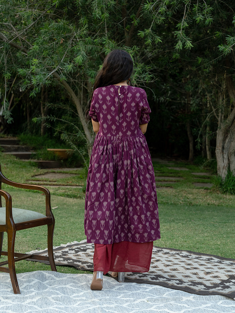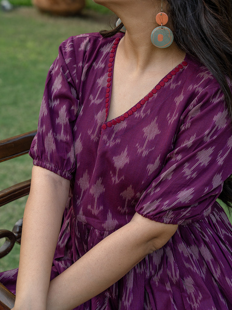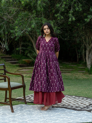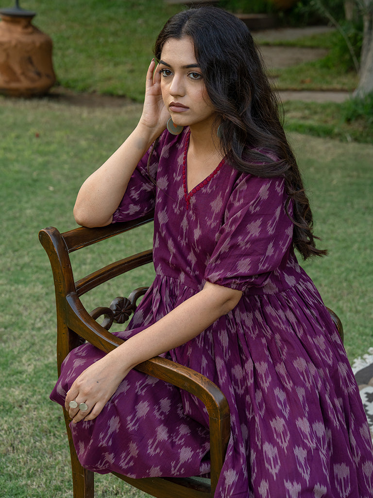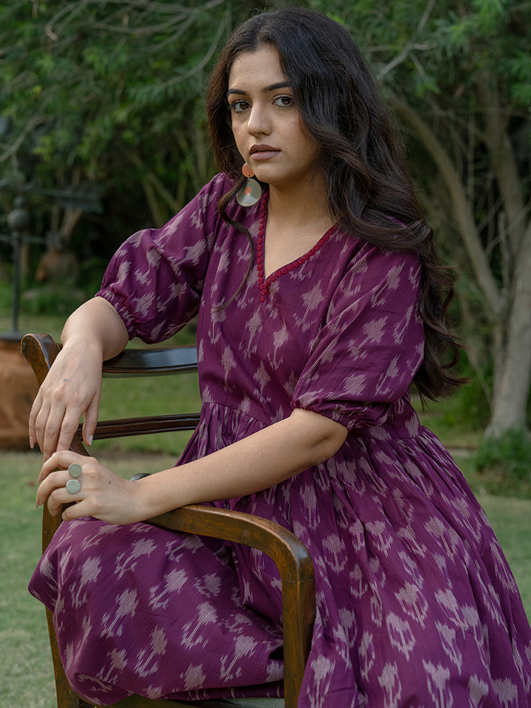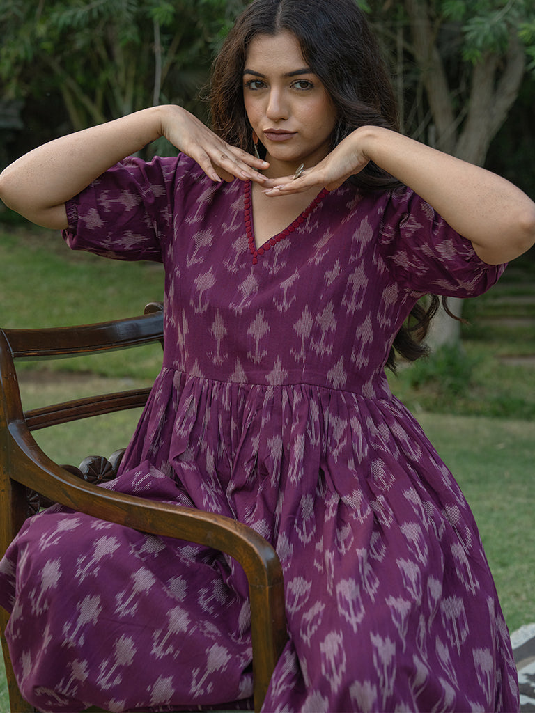 The double-layered magenta dress is a remarkable design reflecting the saga of Victorian vibes. Embrace the exquisiteness of the hand-cut applique Ikat summer dress. This unique style of magenta Ikat cotton maxi dress is made from supreme cotton and mulmul fabric. It feels soft on the skin and soothing in the summer heat. This Ikat dress is the women's must-have fit. It belongs to the origin of Andhra Pradesh and Gujarat. Our artisans’ emotions and devotion are encapsulated in the double-layered pink Ikat dress.