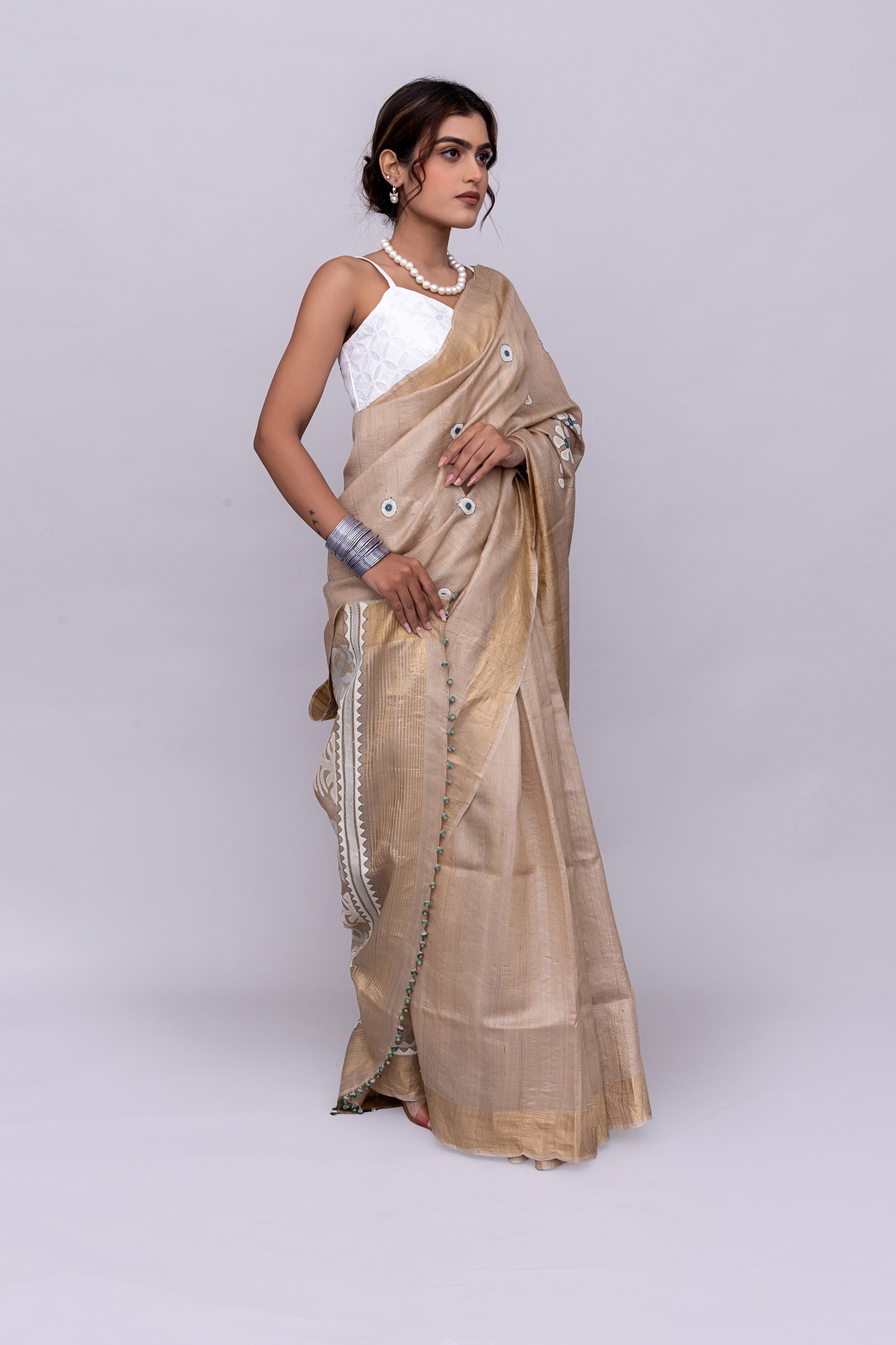 Festive Ivory Tussar Silk Saree With Handcrafted Appliqué and Floral Embroidery