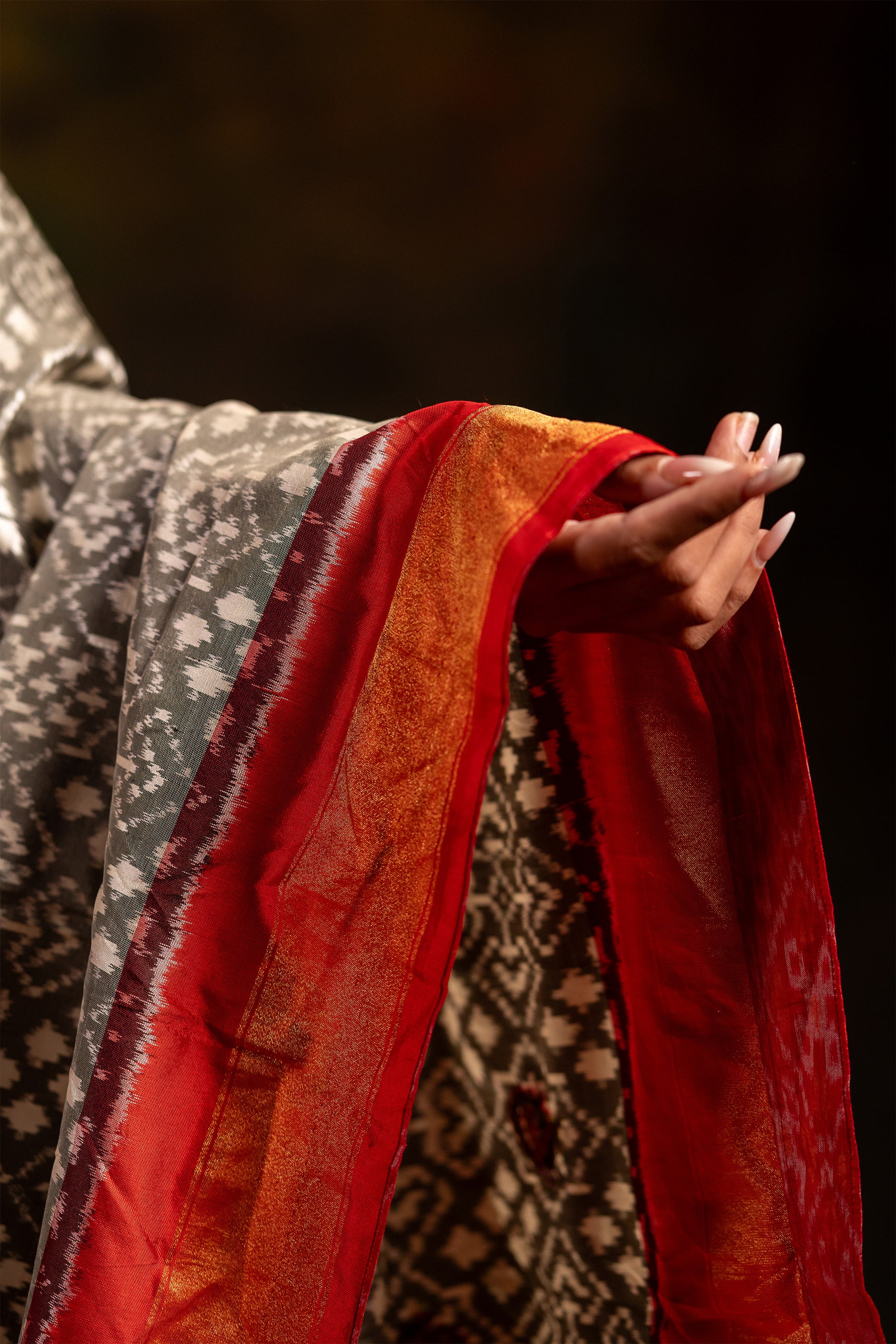 Make a statement this festive season with this 2.5-metre red and grey Patola dupatta, crafted in luxurious silk and tissue fabric. Adorned with traditional Indian motifs, it beautifully showcases the intricate artistry of Patola weaving. The exquisite hangings add a charming touch, making it a standout accessory for any outfit. Lightweight yet elegant, it drapes effortlessly to enhance your festive and special occasion looks. A timeless piece that celebrates heritage craftsmanship and artisanal finesse. Dry clean only to preserve its beauty and intricate detailing.