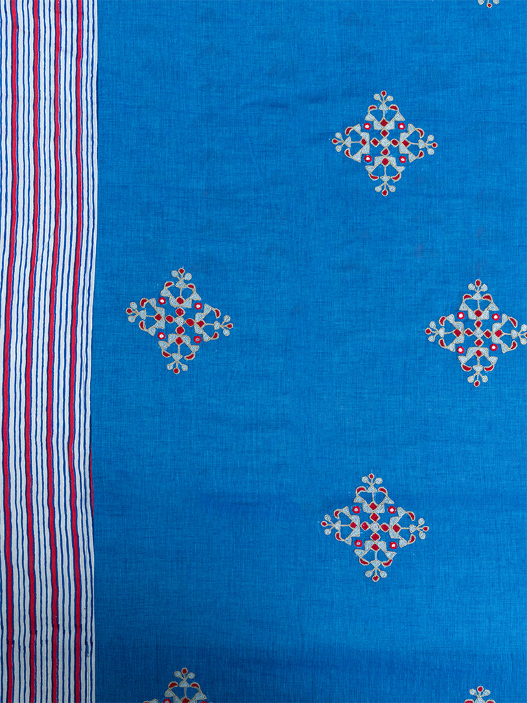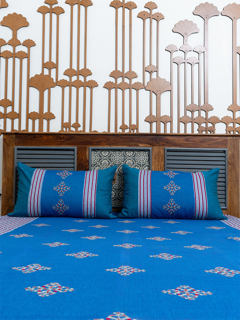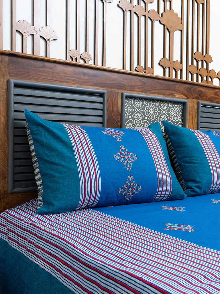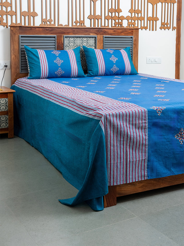 Releasing the beautiful shades of blue bedsheet with pillow covers festooned with intricate aari hand embroidery. Rich south cotton fabric is used to make. This is a fascinating comfortable bedsheet set for your home.