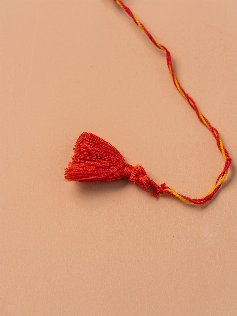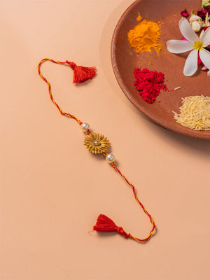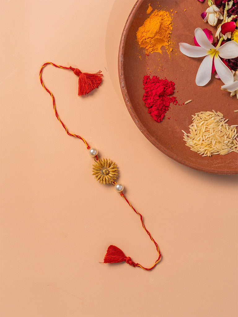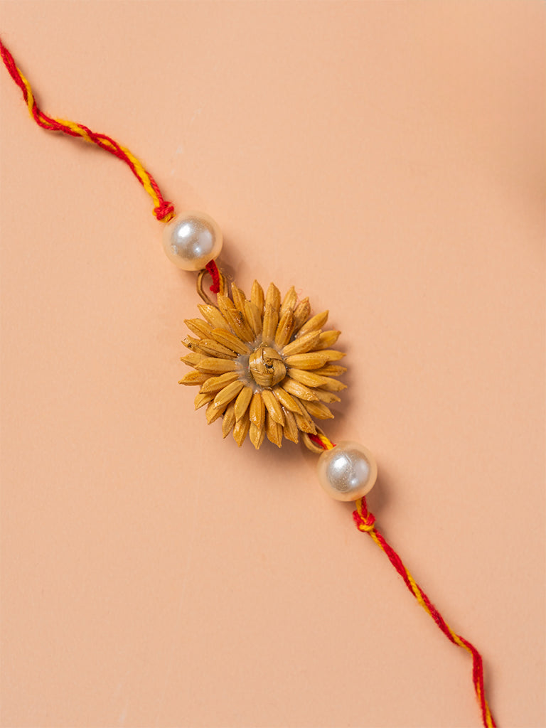 Celebrate the lovely festival of brother and sister with our floral wheat bamboo Rakhi. This exclusive red Rakhi is made using white pearls and soft threads. Tie your brother an amazing handmade Rakhi.