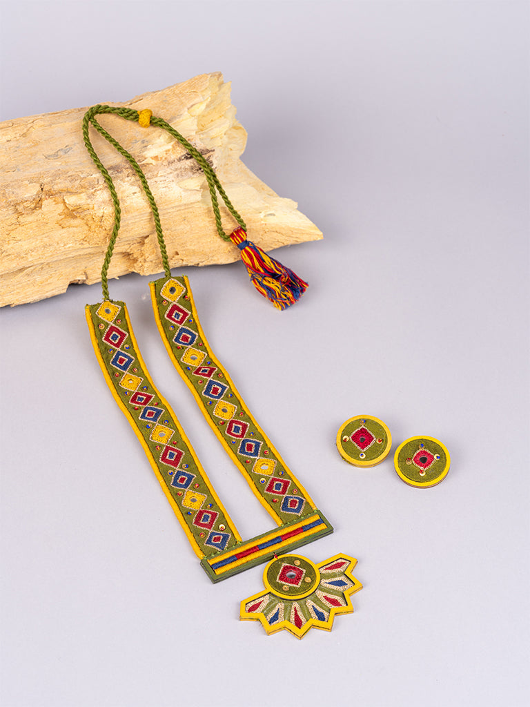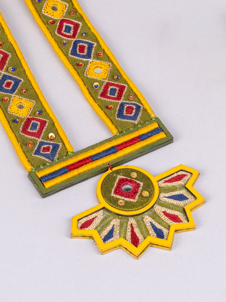 Discover the beauty of a handcrafted necklace adorned with mirrors, beads, and tassels. The classic touch of aari hand embroidery and intricate handwork is also witnessed in the design. Interestingly, it's available in free size. To strengthen this necklace an exclusive fabric is placed on the MDF block. Shop now at Craftroots for this alluring multi-coloured necklace for your special occasions.