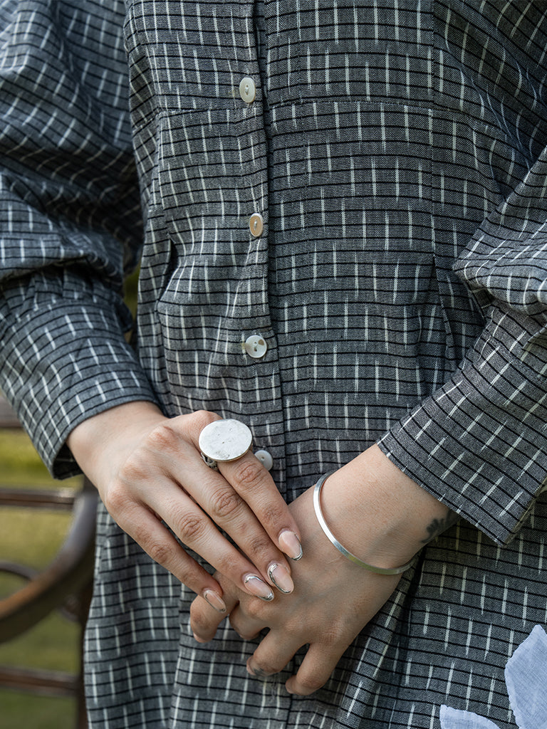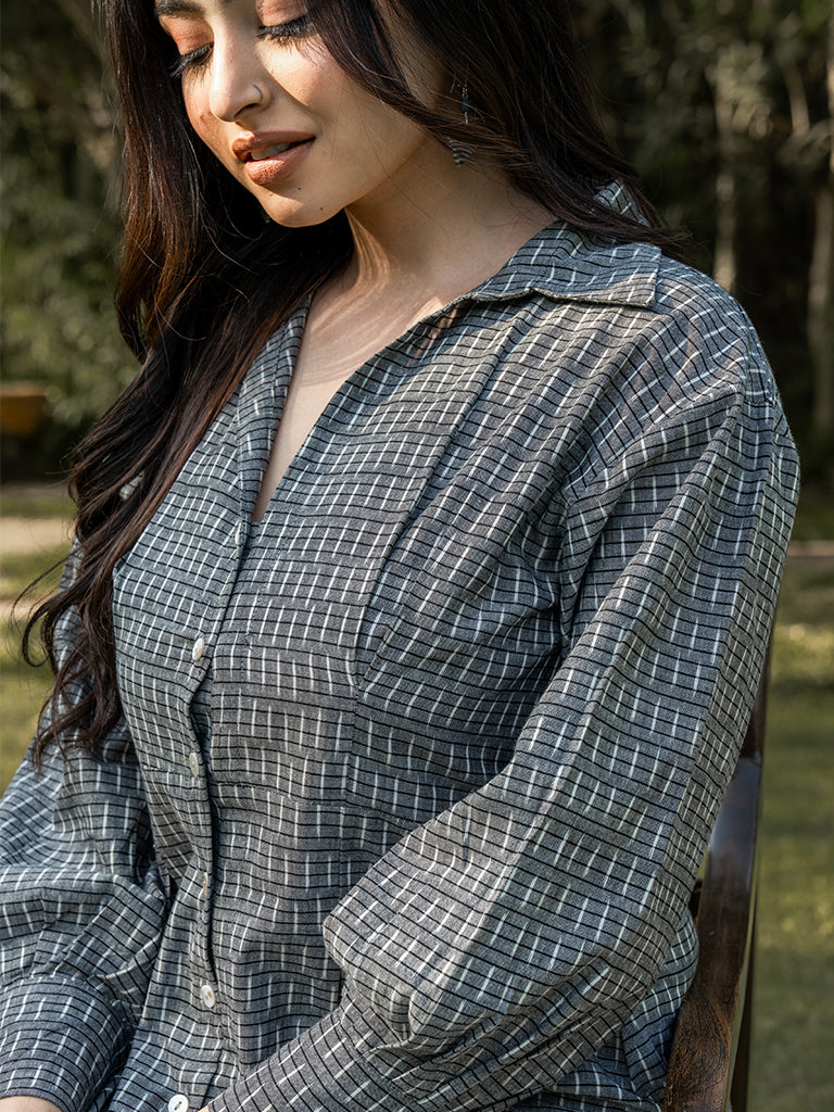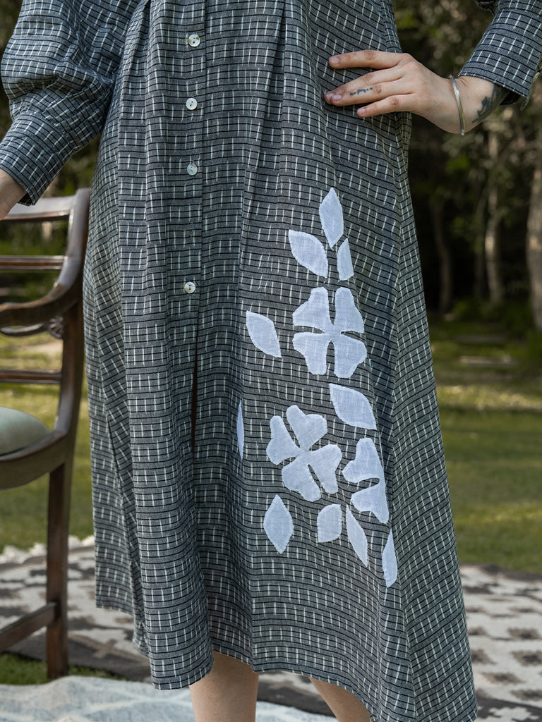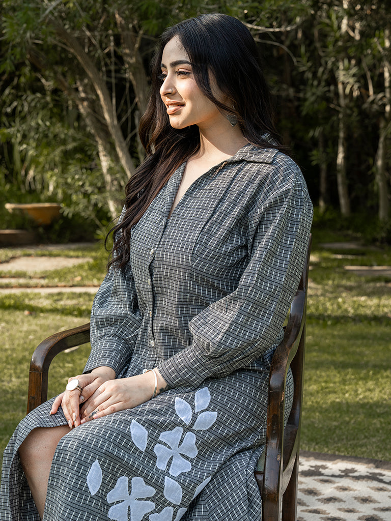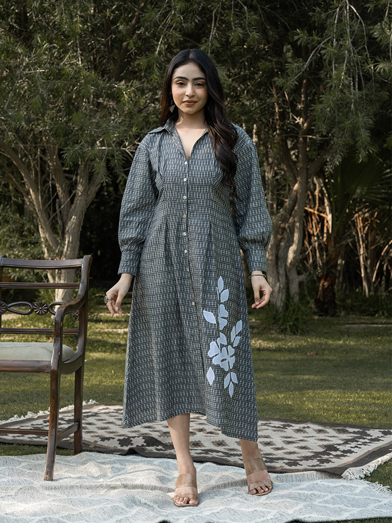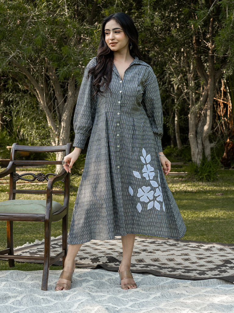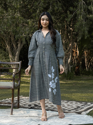 Introducing the elegance of the front open grey shirt dress crafted with comfort as a priority. Made from soothing, exceptional cotton fabric, this Ikat print dress showcases the time-honoured art of hand-cut applique, skillfully executed by our artisans. Carefully handmade with love and attention to detail, it enhances its uniqueness. This beautiful and breathable grey Ikat dress embodies a modern fashion statement. Pair it with this remarkable front open blue shirt dress to achieve a striking style.