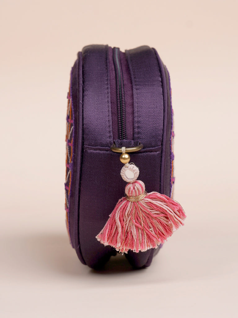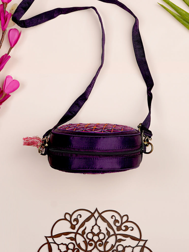 Get into the realm of a geometrical dots circular bag crafted with utmost precision and beauty. The acute detailing of the khat and handwork signifies the traditional heritage and culture of our values. Embrace the modesty of geometric dots pattern designed with the detailed handwork of our artisans. This purple circular modern bag is made of the superior threads, and fabric, and embedded with mirrors. Ancient crafts seen on this bag belong to the region of Gujarat. It is a worthy piece of bag to style for your casual meetings and social gatherings. The flawless combinations of colours are used with the ultimate level of craftsmanship. Handmade by our skilled artisans with sheer love and with attention to detailing.