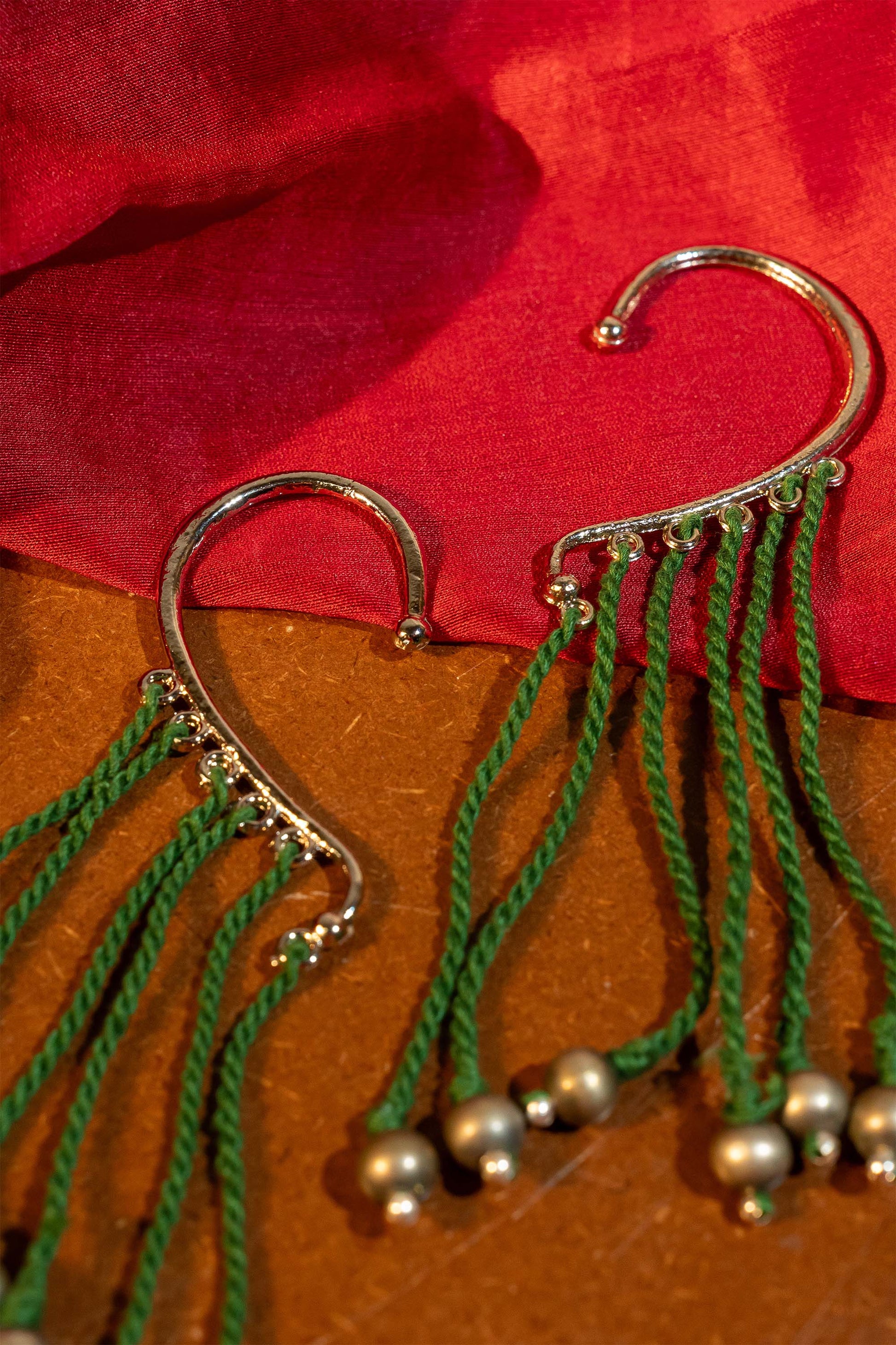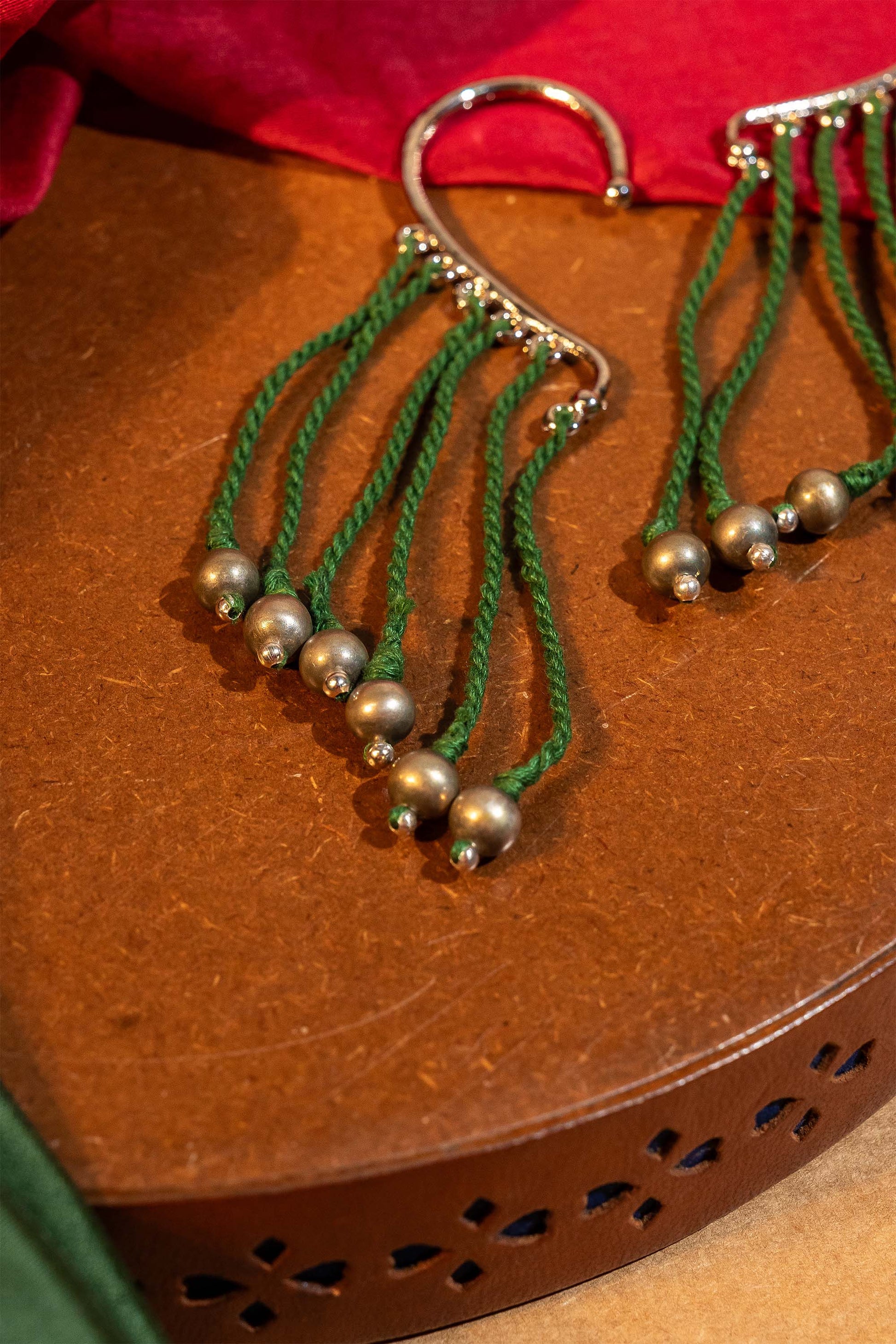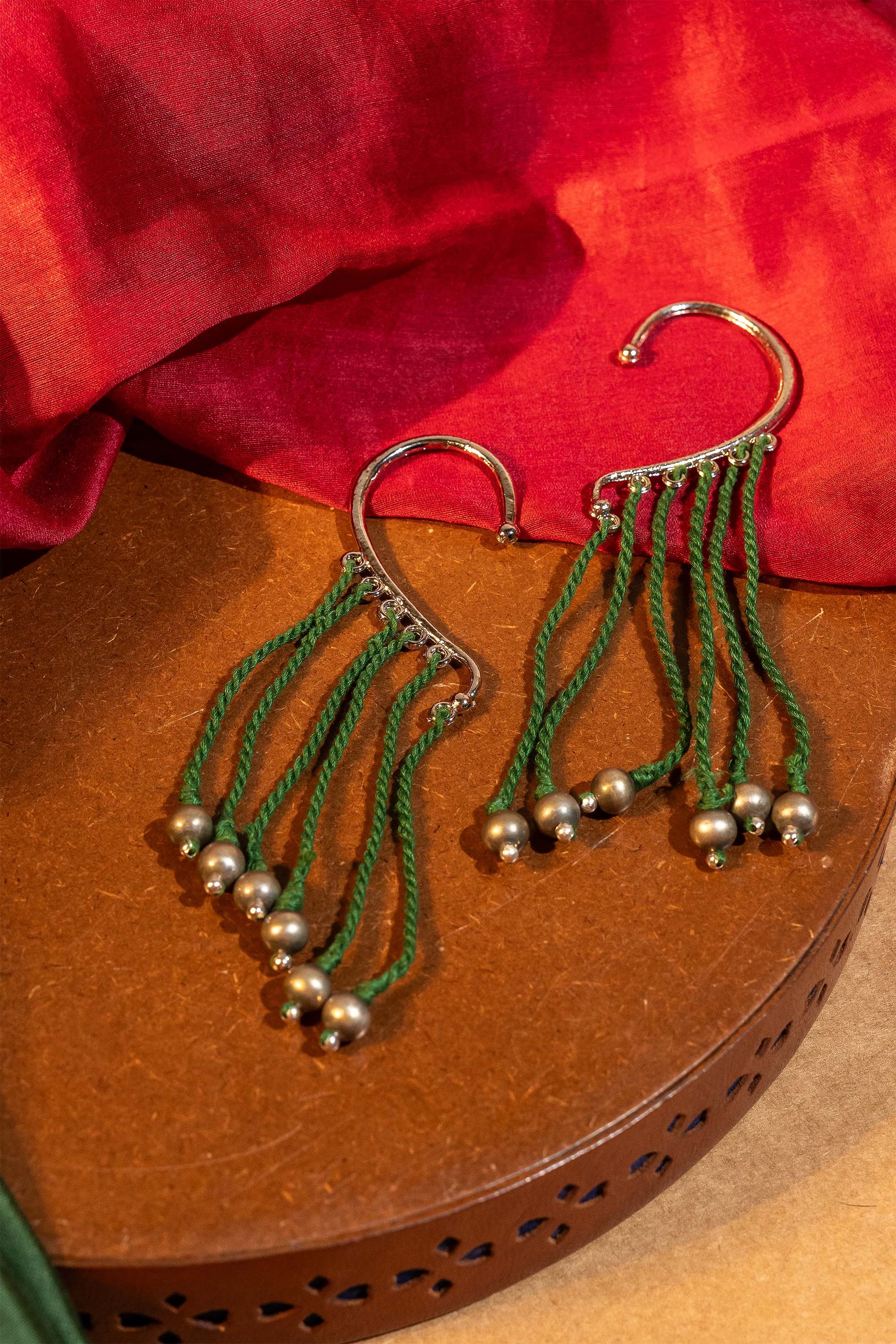 Make a bold festive statement with this elegant olive green ear cuff dangler, designed to add a unique twist to your Navratri look. Expertly handcrafted by skilled artisans, it combines intricate metal accents with vibrant thread and durable cord work. The earthy olive green tones bring a modern edge to traditional design, making it a versatile piece for any celebration. Lightweight yet striking, this ear cuff ensures comfort while turning heads. Each detail reflects hours of meticulous craftsmanship, celebrating India’s rich artisanal heritage. Pair it with lehengas, sarees, or fusion ensembles to create a standout festive style. Part of Craftroots’ exclusive Navratri Collection, this piece embodies artistry and elegance in every thread.