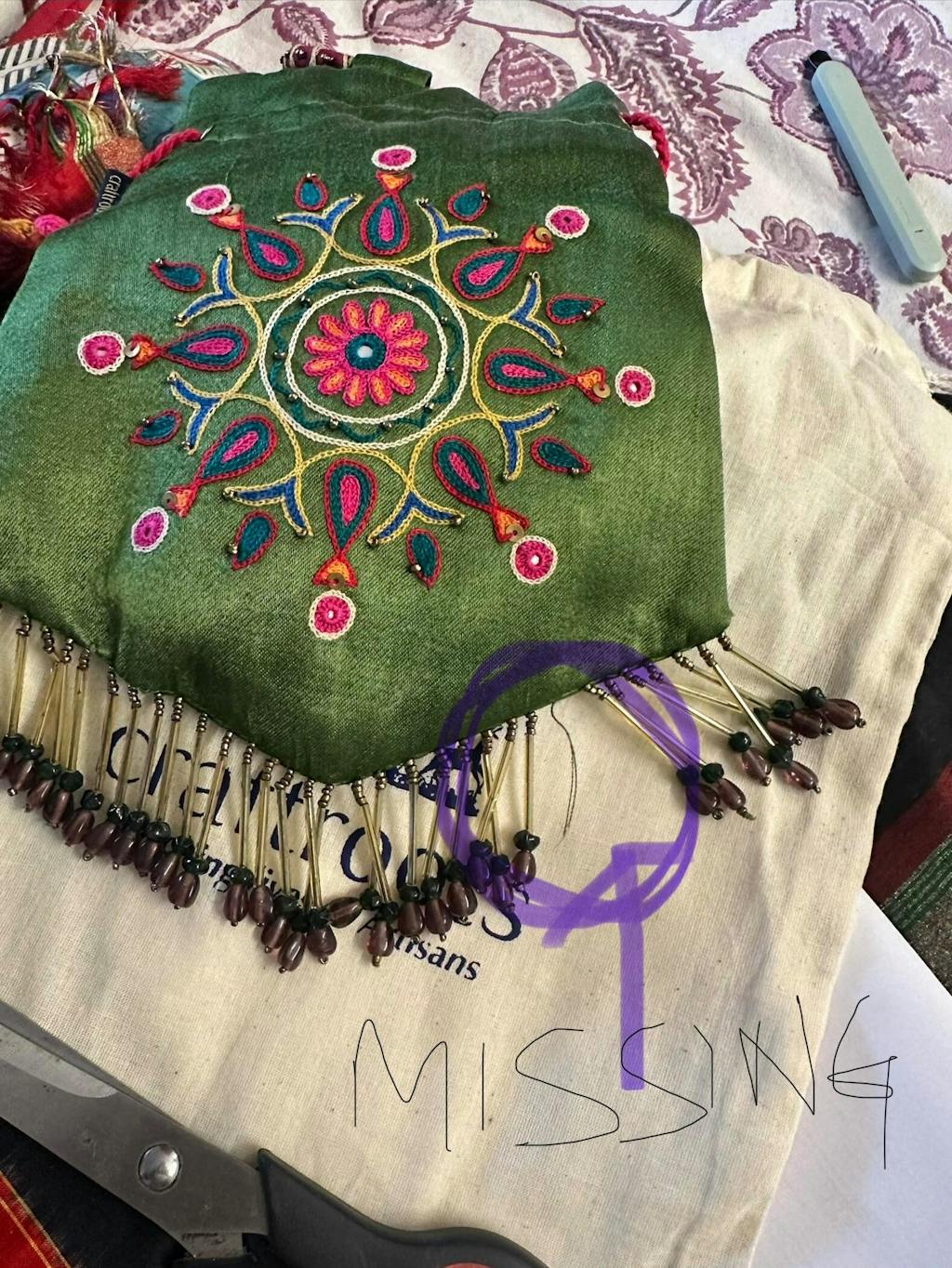 Add a festive touch to your look with this handcrafted Green Kutchi Aari Pentagon Potli, designed with geometric elegance.