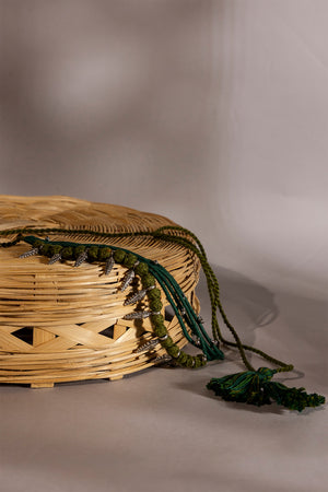 Layers of rich green cord and thread are paired with fine metal detailing, giving it a bold yet refined look.