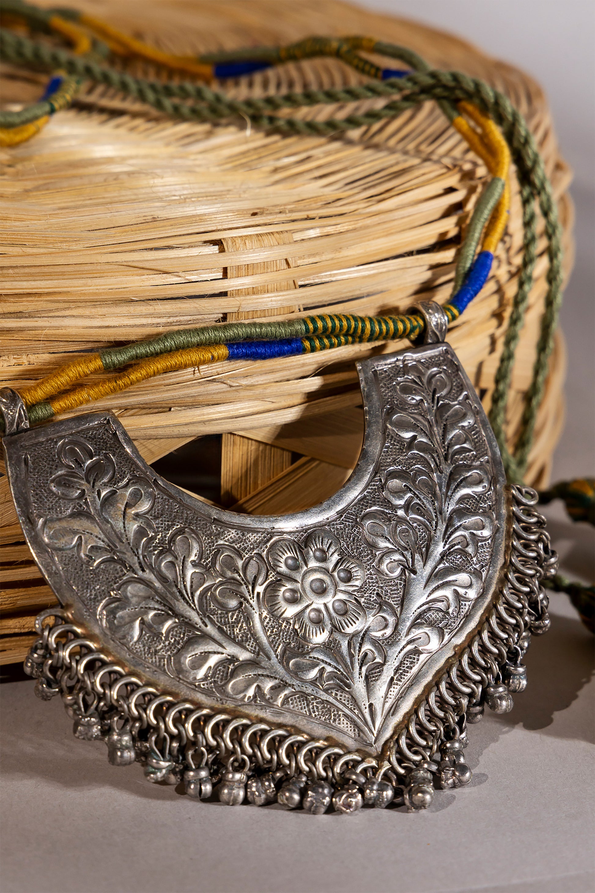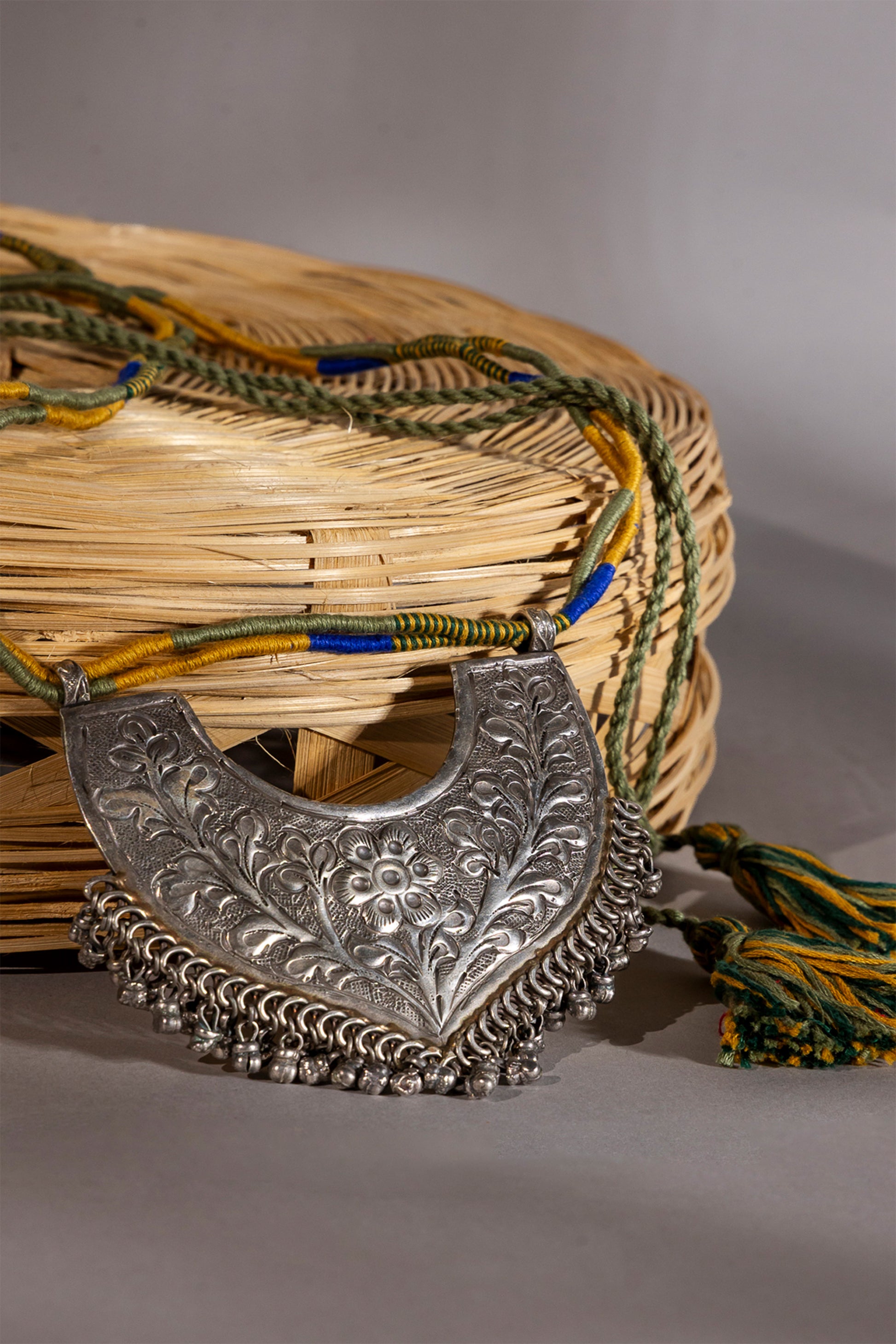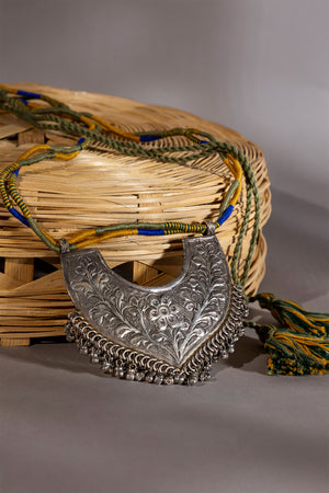 Enhance your jewelry collection with this exquisite Green Long Oxidised Pendant, a perfect blend of traditional craftsmanship and contemporary design. Handcrafted with care using metal, thread, and cord, it features intricate metal detailing and delicate handwork, reflecting the artistry and precision of skilled artisans.
