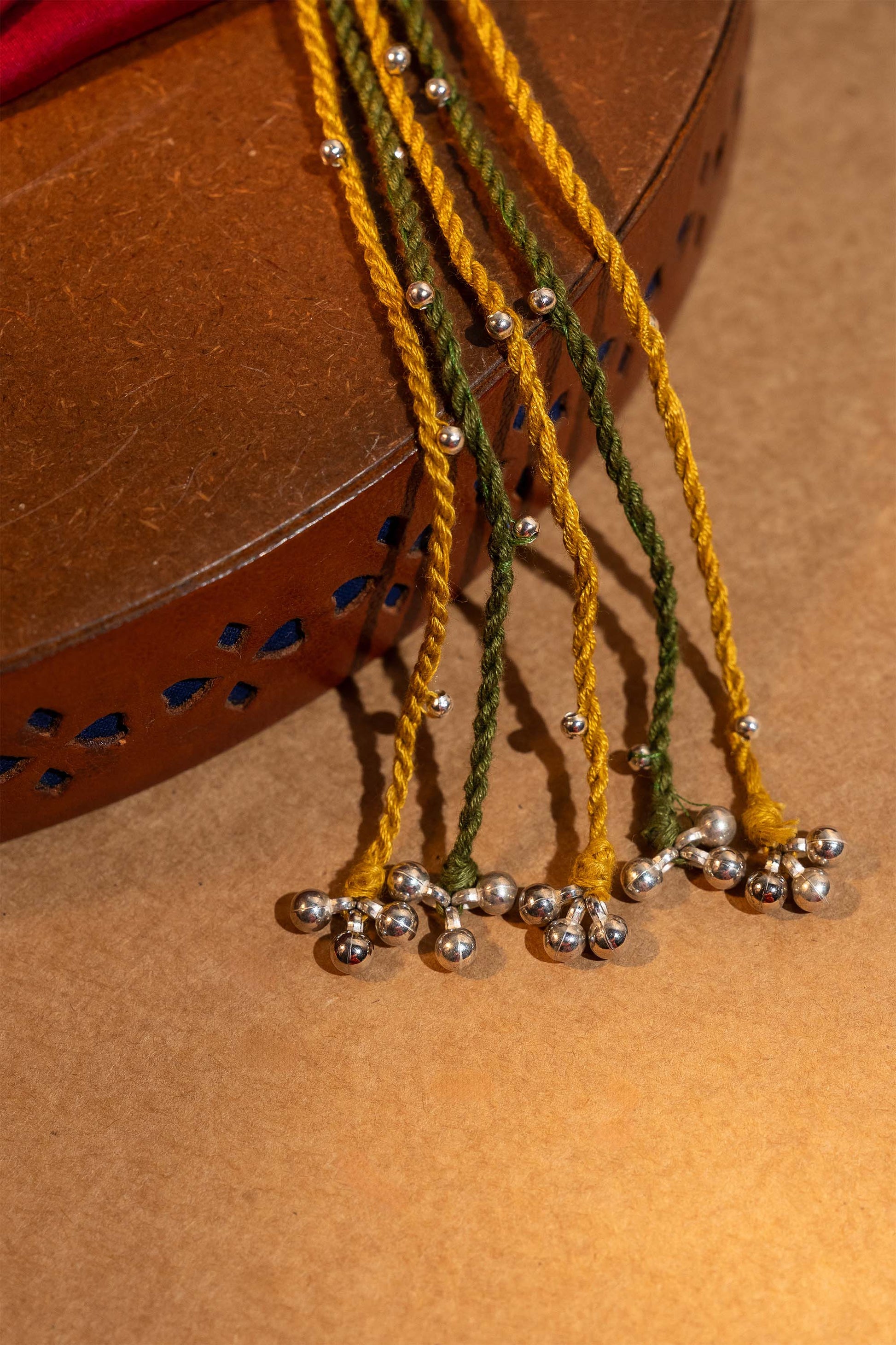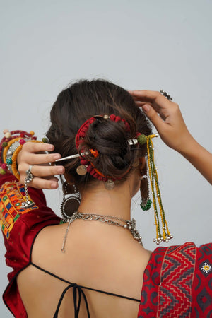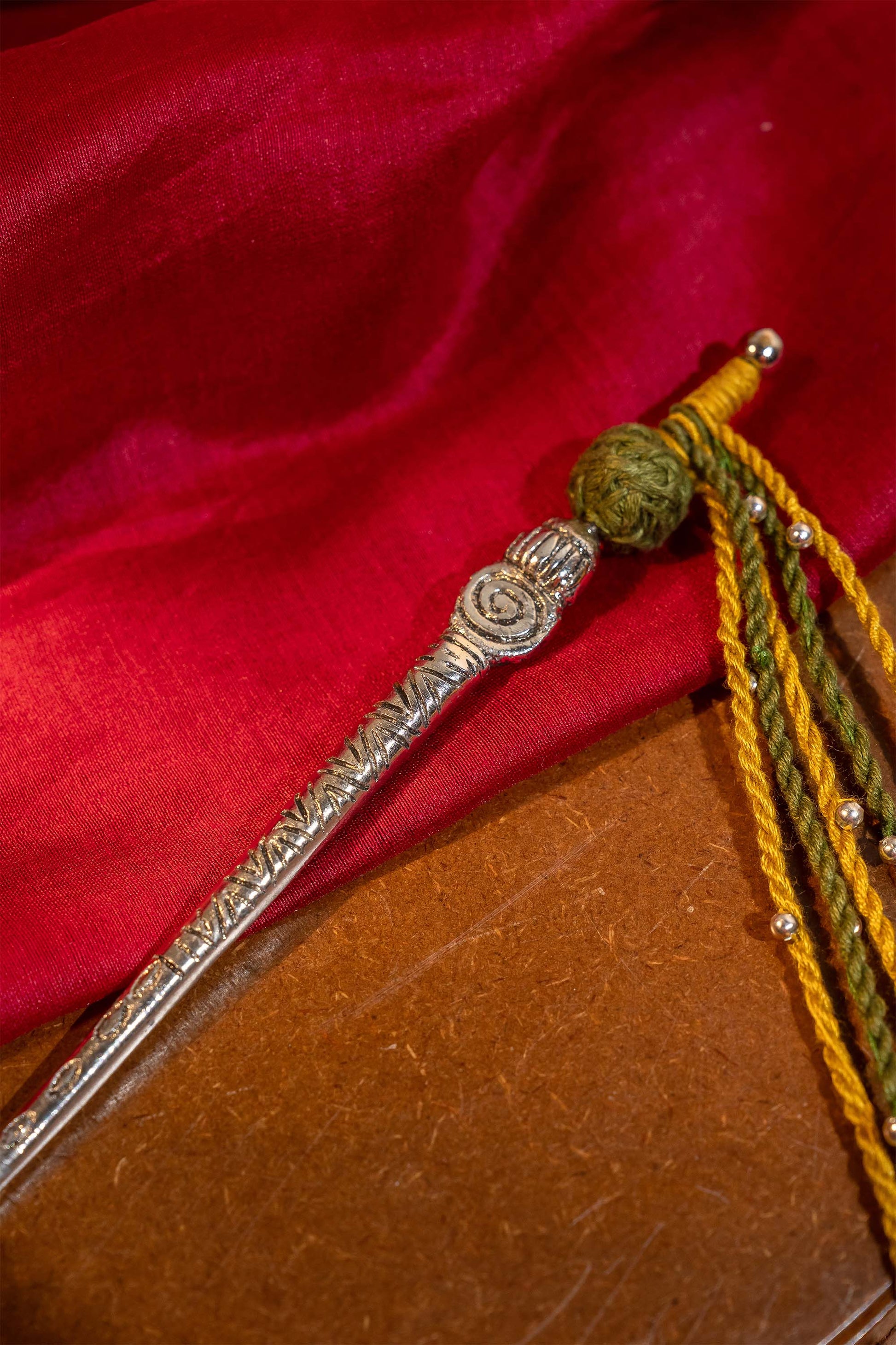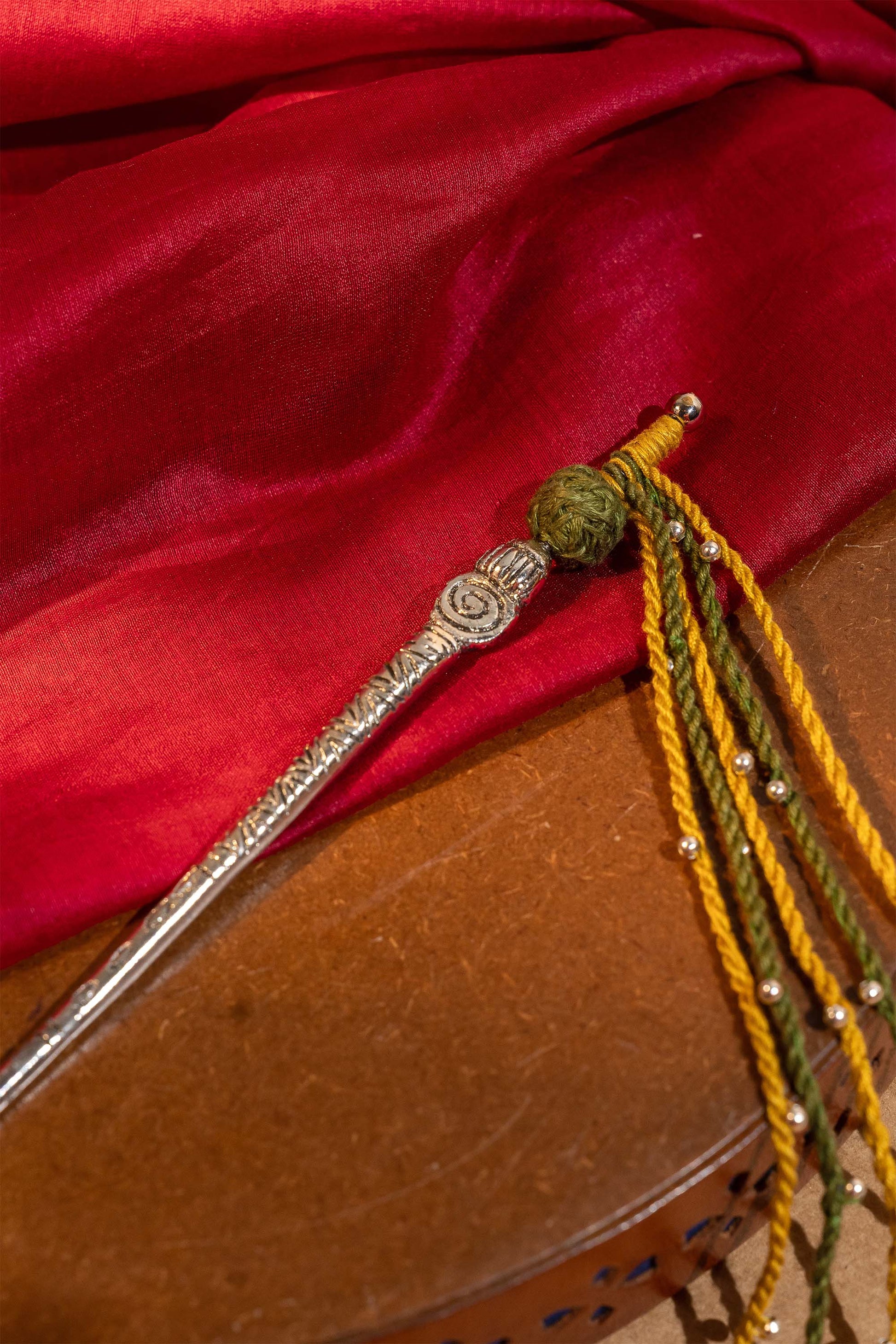 Elevate your look with the Green String Hair Stick, a handcrafted accessory designed for versatile styling. Featuring fine metalwork, vibrant threads, and delicate metal balls, this piece is a testament to skilled artisan craftsmanship. Handmade with love and compassion, it blends tradition with contemporary elegance. Perfect for festive occasions or everyday wear, it adds a unique charm to any hairstyle. Celebrate heritage crafts while embracing timeless style with Craftroots.