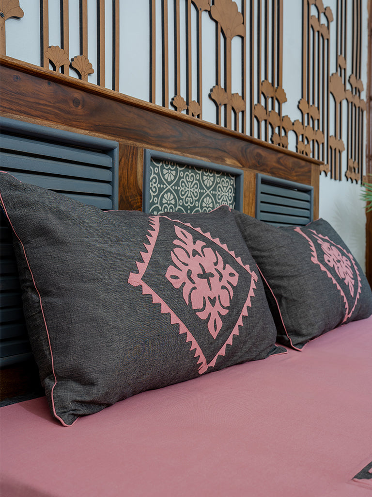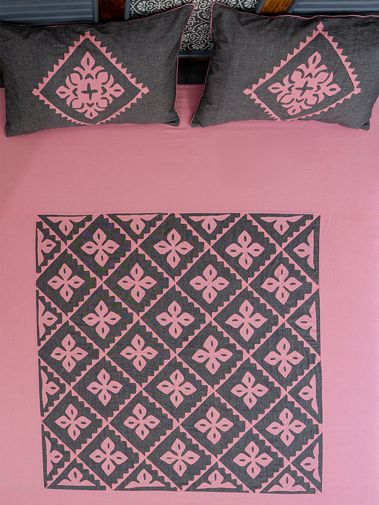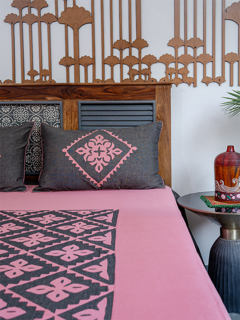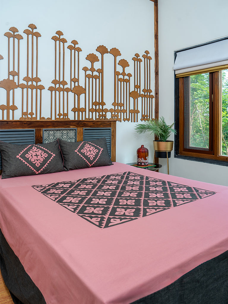 Bringing the grey and pink checks bedsheet set made out of the finest cotton fabric. The flawless grey bedsheet is handcrafted by our artisans with love and precision. Bring home the exclusive hand-cut appliqué bed sheet to uplift your room space. The beautiful designs look elegant and modest in Indian colours for your room. The craft used in this bed sheet belongs to the Gujarat region. It has gorgeous designs to elevate the look of the room. Traditional touch is given using intricate craftsmanship by our talented artisans. It is easy to maintain and reflects the sheer comfort of sleeping. This bed sheet comes with a set of pillow covers. Handmade by our artisans and originating in the region of Gujarat.