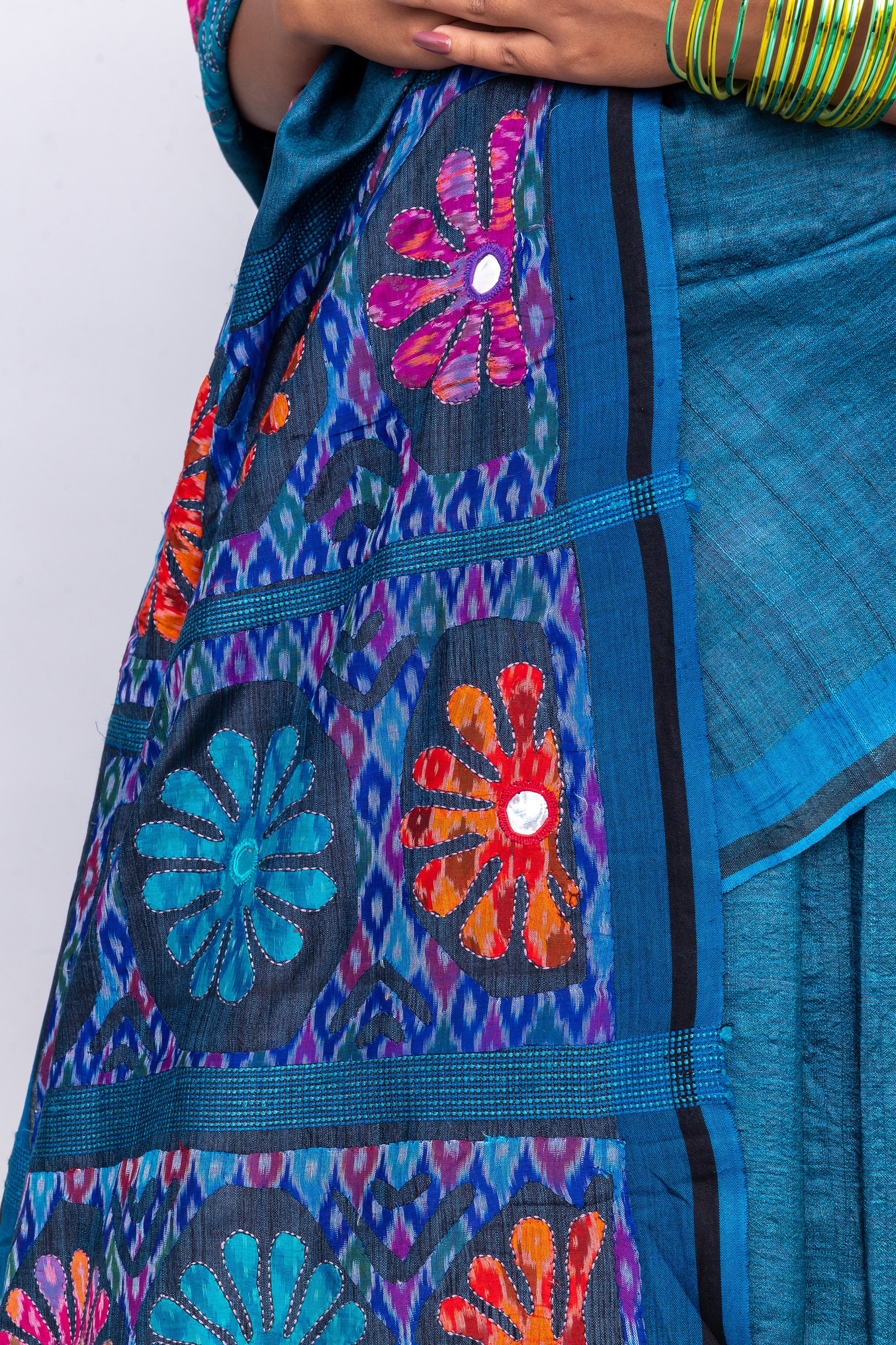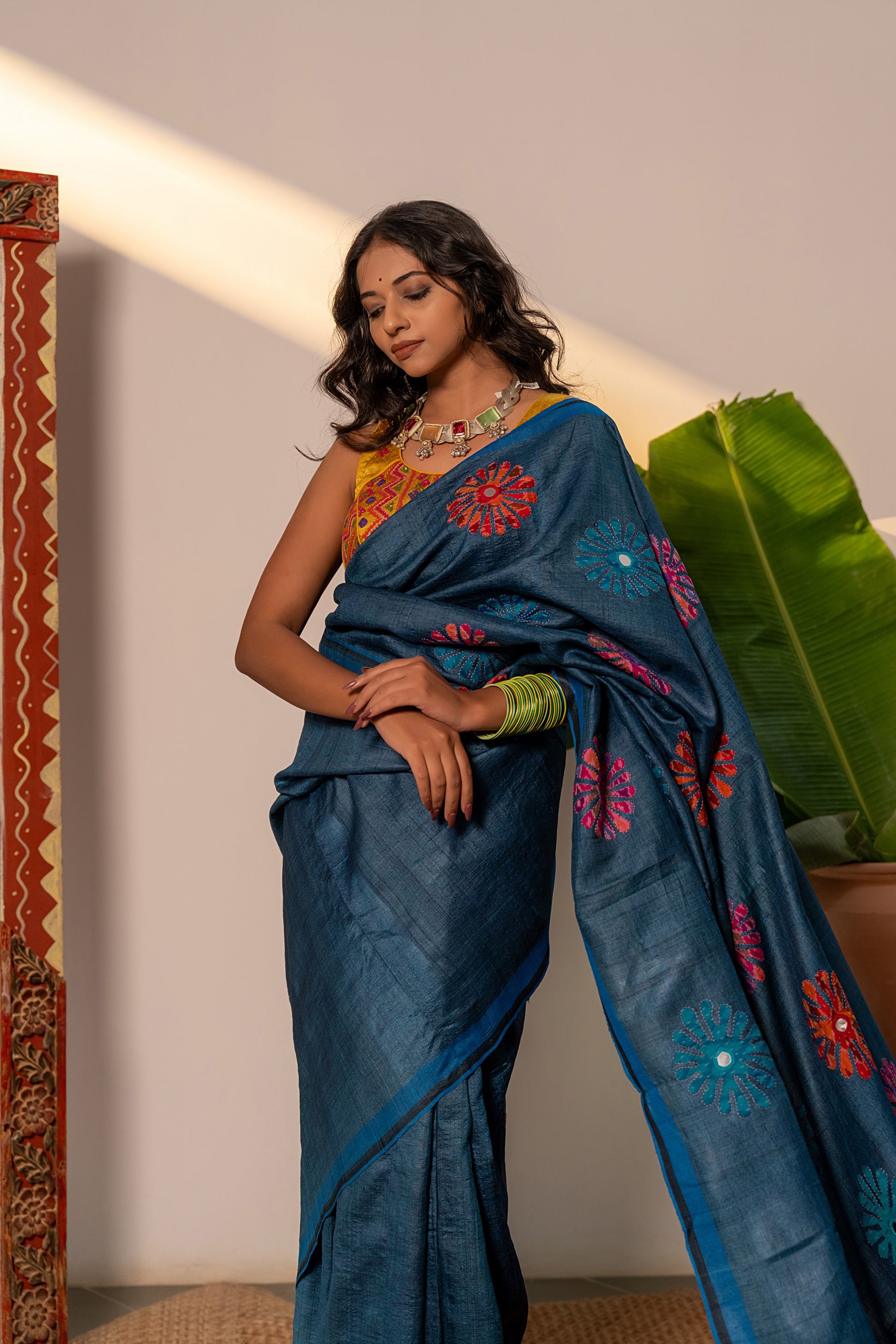 Handcrafted Blue Tussar Silk Saree – Artisanal Appliqué Elegance