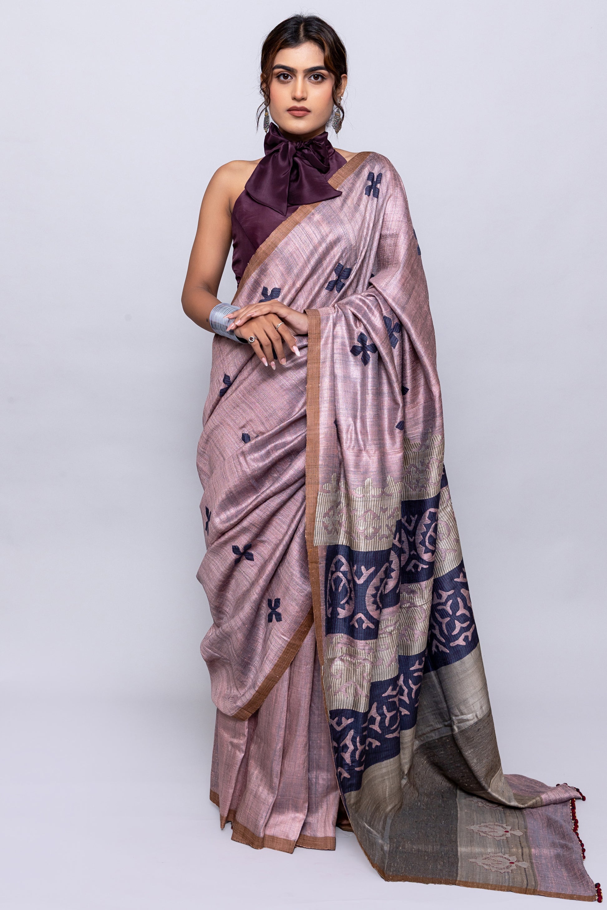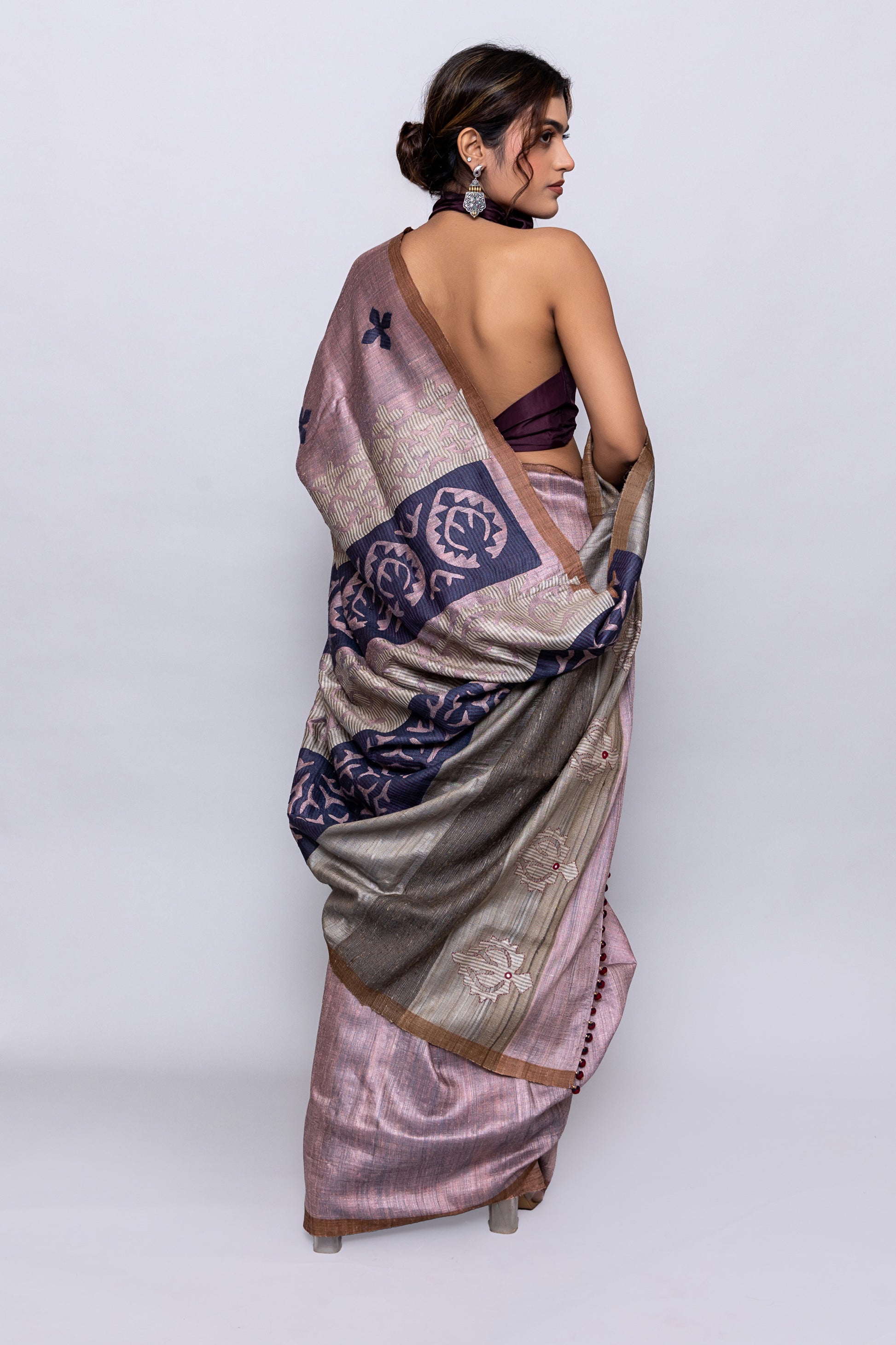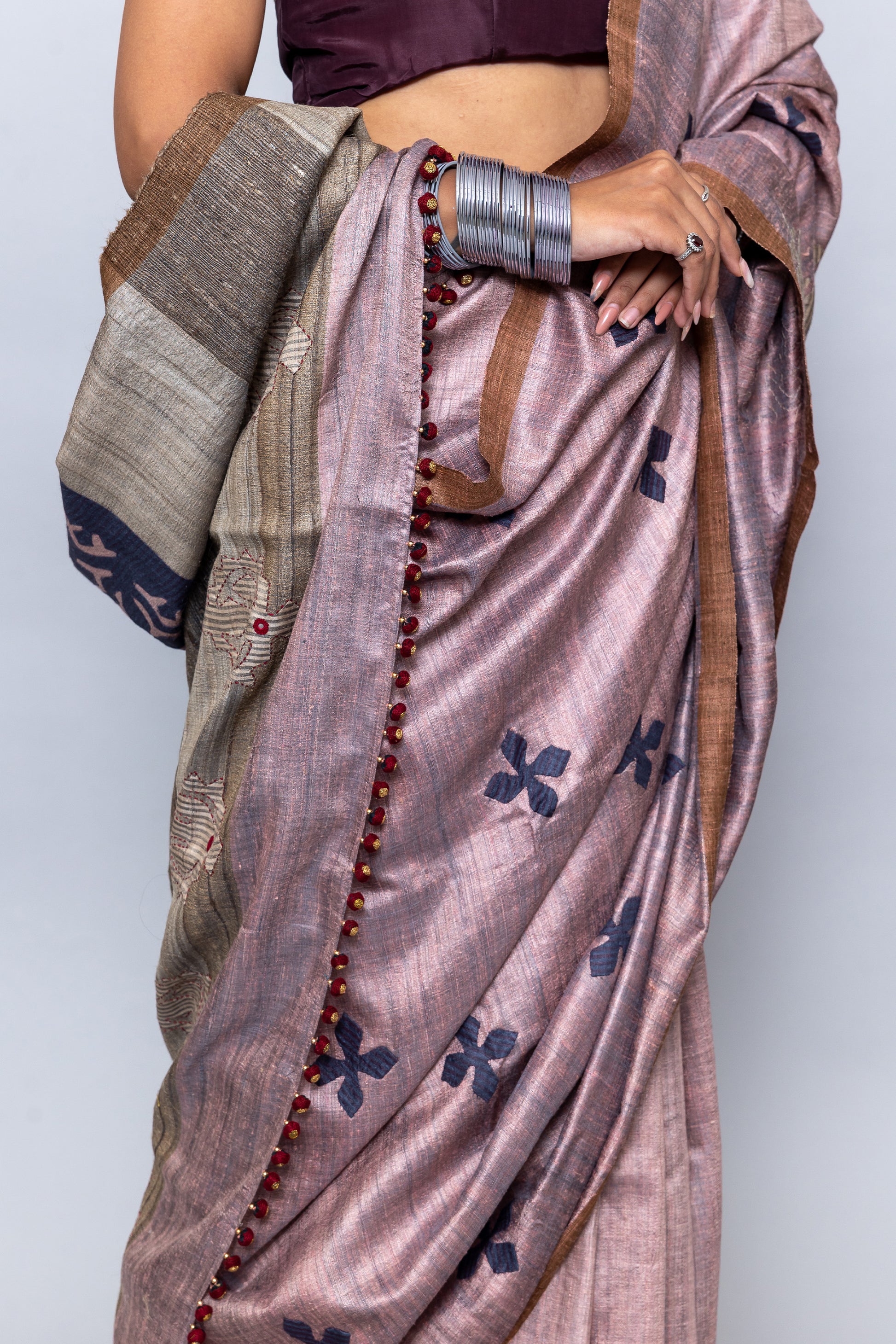 Handcrafted Lavender Tussar Silk Saree – Artisanal Appliqué Elegance