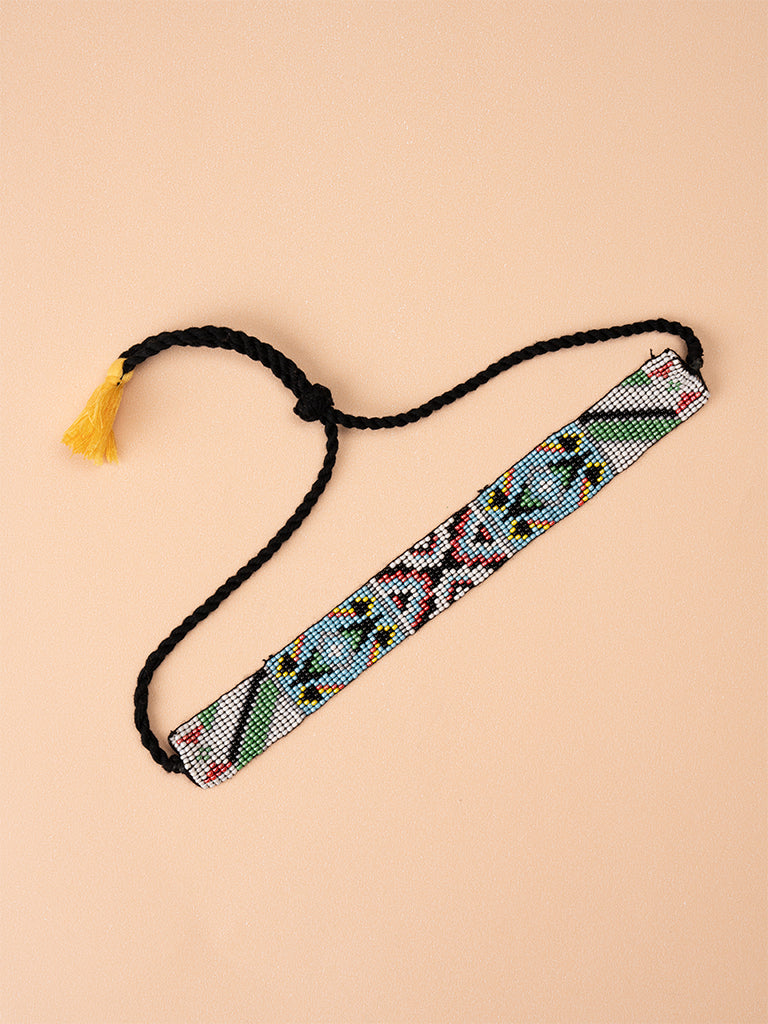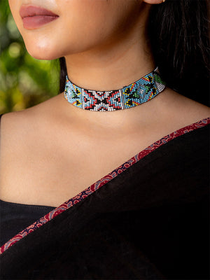 Explore the traditional handmade choker reflecting an essence of artsy vibes. The multi-colour choker is adorned meticulously with beads and stunning handwork. This chic neckpiece is designed using supreme cotton threads with an essence of Gujarat.
