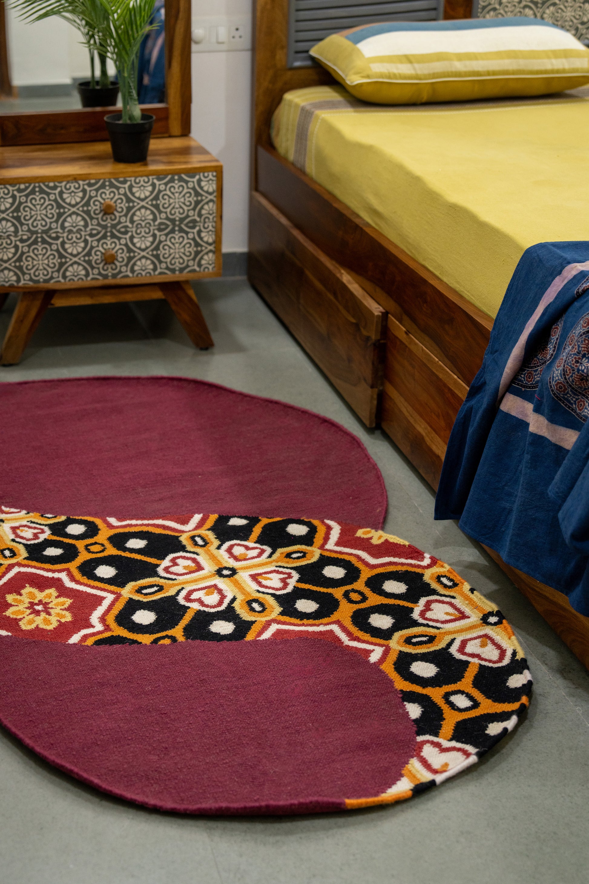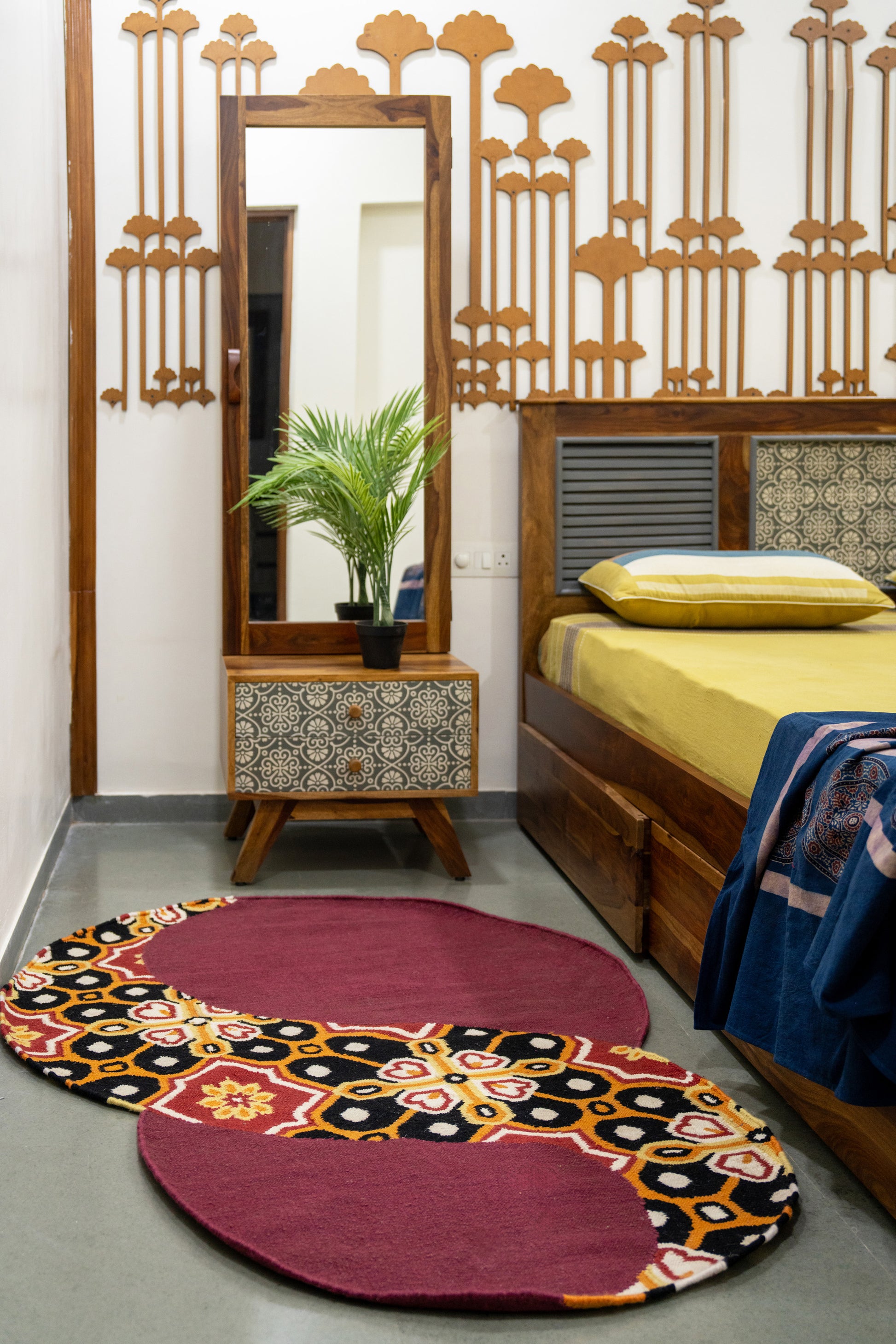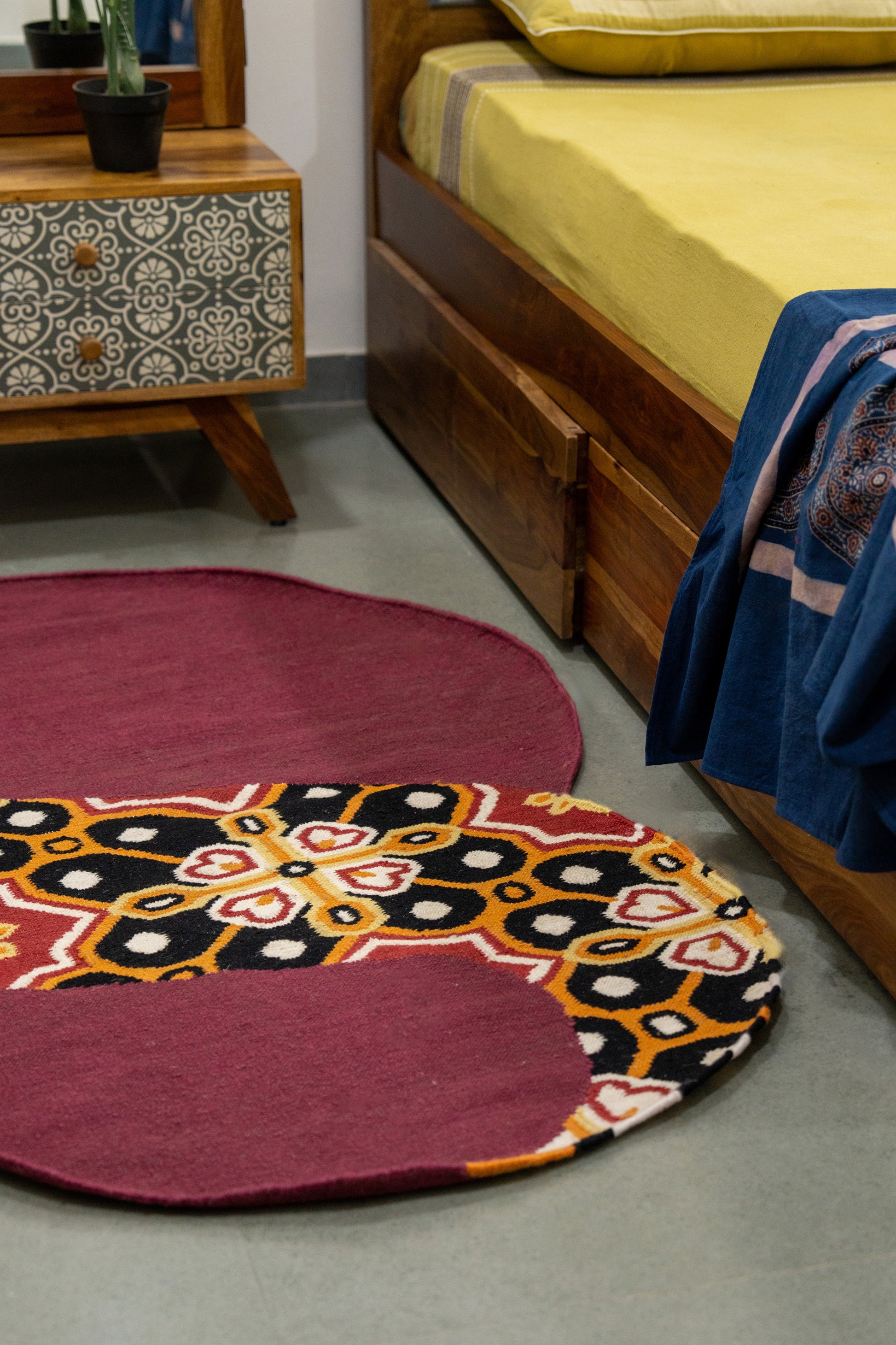 Its artistic spiral patterns draw inspiration from traditional Indian motifs reimagined with a contemporary touch. Each rug is crafted by skilled artisans, reflecting a perfect blend of heritage and modern sophistication. Available made to order, this luxurious handwoven piece is designed to bring depth, warmth, and timeless elegance to your interiors. Wash care: Shedding is an inherent quality of a handcrafted rug, reflecting its authenticity.