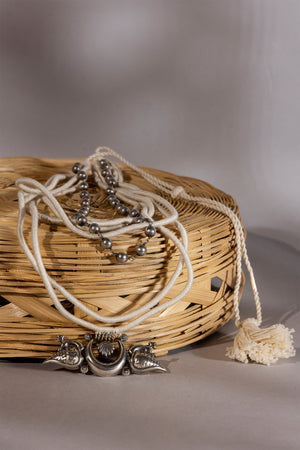 Elevate your look with this elegant Ivory Layered Necklace, beautifully crafted to add sophistication to any outfit. Designed with multiple delicate layers, it blends metal, thread, and cord elements to create a distinctive artisanal charm. The necklace features intricate handwork, giving it a refined and premium finish.