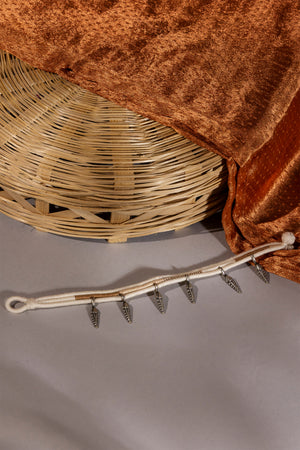 The Ivory Oxidised Leaf Anklet is a stunning handcrafted accessory that blends delicate artistry with contemporary elegance. Featuring intricately designed oxidised metal leaves layered over soft ivory threads and cords, this anklet creates a striking, textured look that adds movement and charm to every step. Handcrafted with meticulous attention to detail, it perfectly balances traditional metalwork with modern design, making it ideal for casual wear, festive occasions, or boho-inspired ensembles. Lightweight and comfortable, the anklet’s neutral ivory tones complement a variety of outfits while the oxidised leaf motifs provide a subtle yet eye-catching accent. Each piece reflects the dedication and skill of the artisans, celebrating the heritage of handcrafted jewelry while offering a unique, timeless accessory.