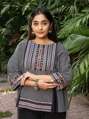 Style yourself in a modest Karnataka weave box pleated top, adorned with intricate handwork. Perfect for casual chic styling, this rich cotton fabric top is an ideal addition to your wardrobe. Discover a refined alternative for your everyday look.