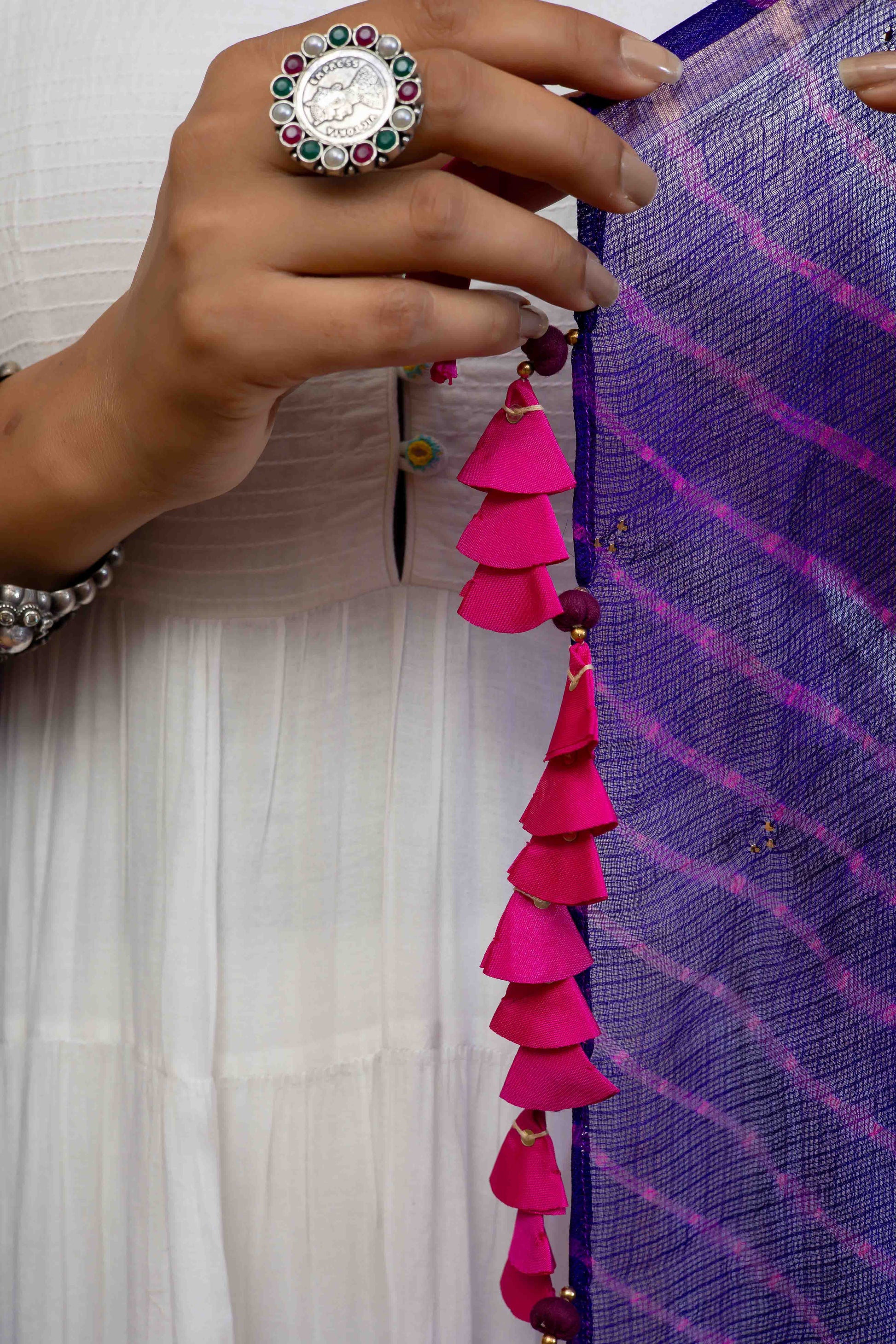 The vibrant blue base is uplifted by soft hints of pink; creating a refreshing contrast that’s both playful and refined. Finished with handmade tassels at the edges; this piece is made with love and the finesse of skilled artisans. Perfect for festive styling; cultural outings; or vibrant everyday layering.