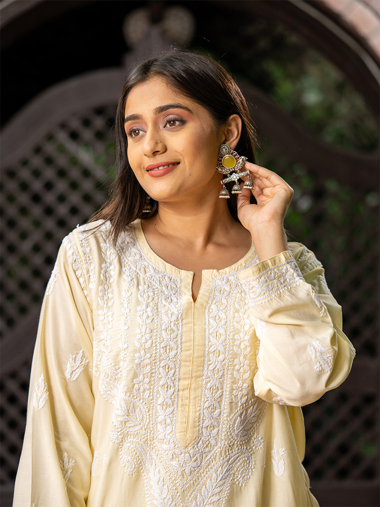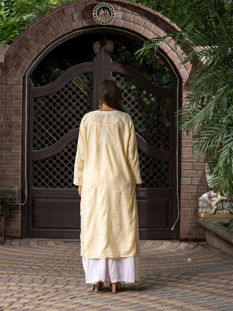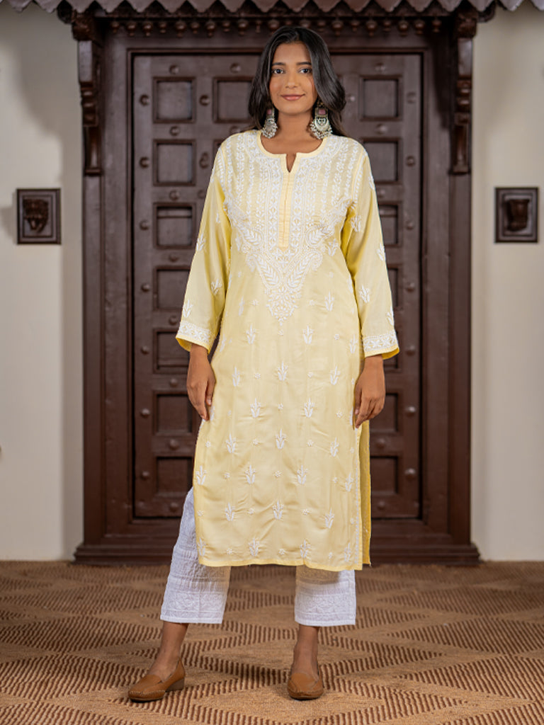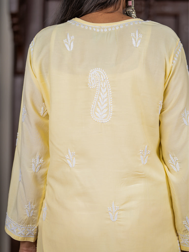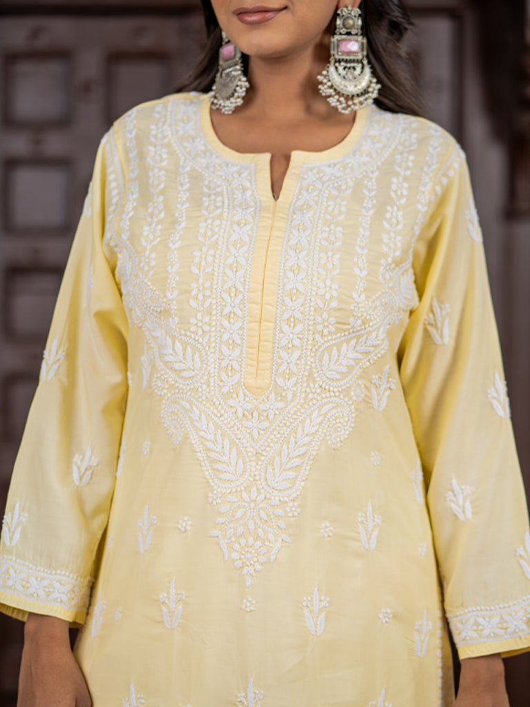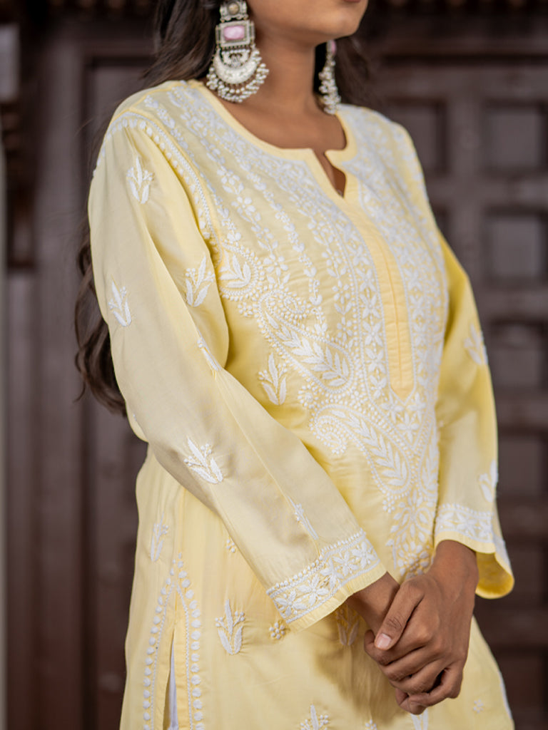 The short kurta in light yellow exudes a charm suitable for all festivities. Embrace the modal kurta, which boasts intricate detailing to elevate its appeal. The piece is adorned with floral buttas, adding to its overall allure.