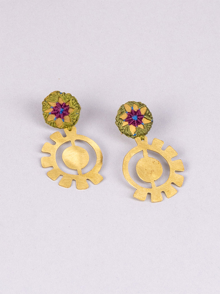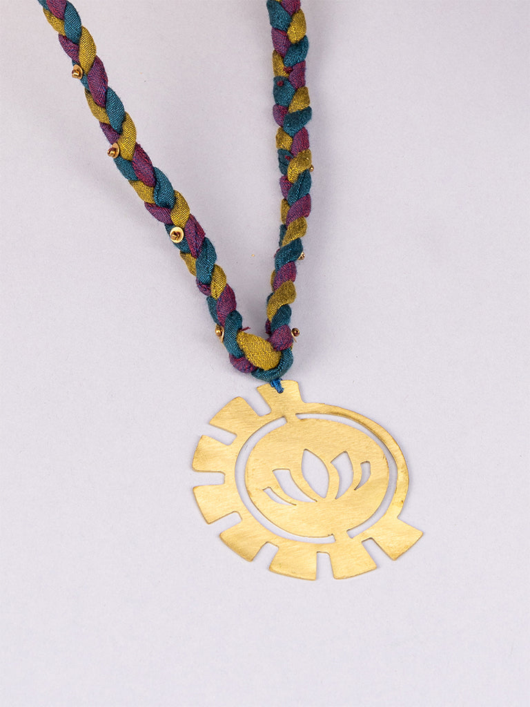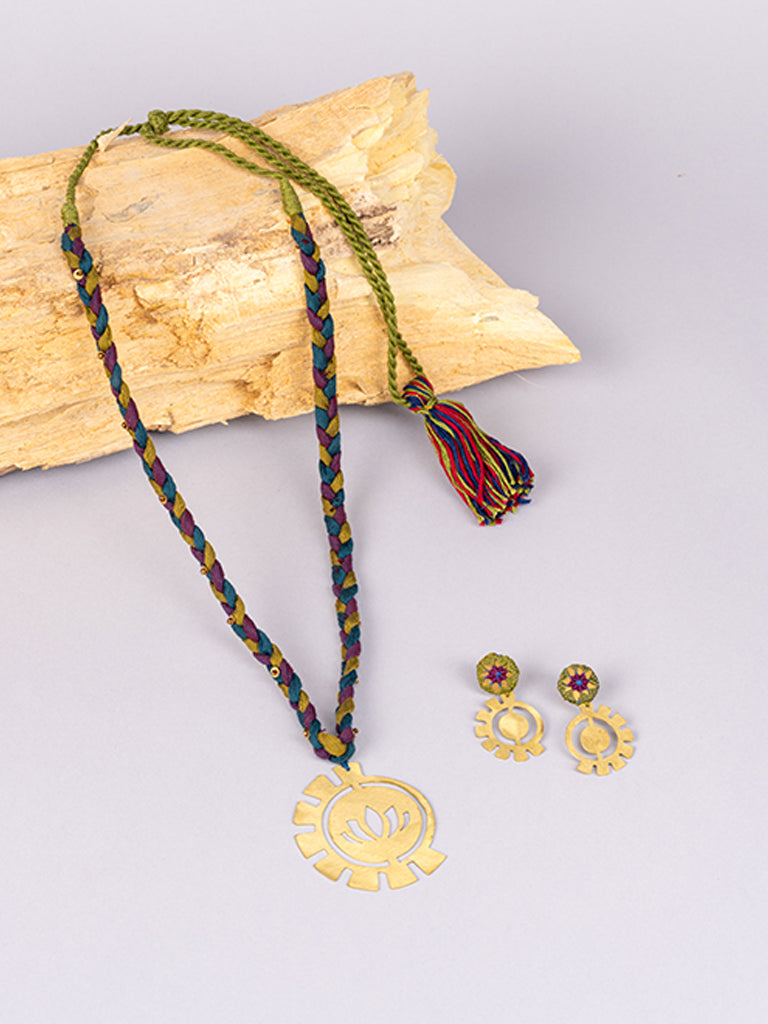 Explore an exquisite piece of necklace handcrafted meticulously by our skilled artisans. It's a perfect necklace to gift your favourites. Witness the beauty of hand-cut brass with multi-coloured threads to style. Truly a gorgeous free-size neckpiece with earrings for an everyday ensemble edit.