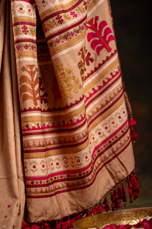 Luxury Satin Silk Saree in Beige With Red Hand Appliqué