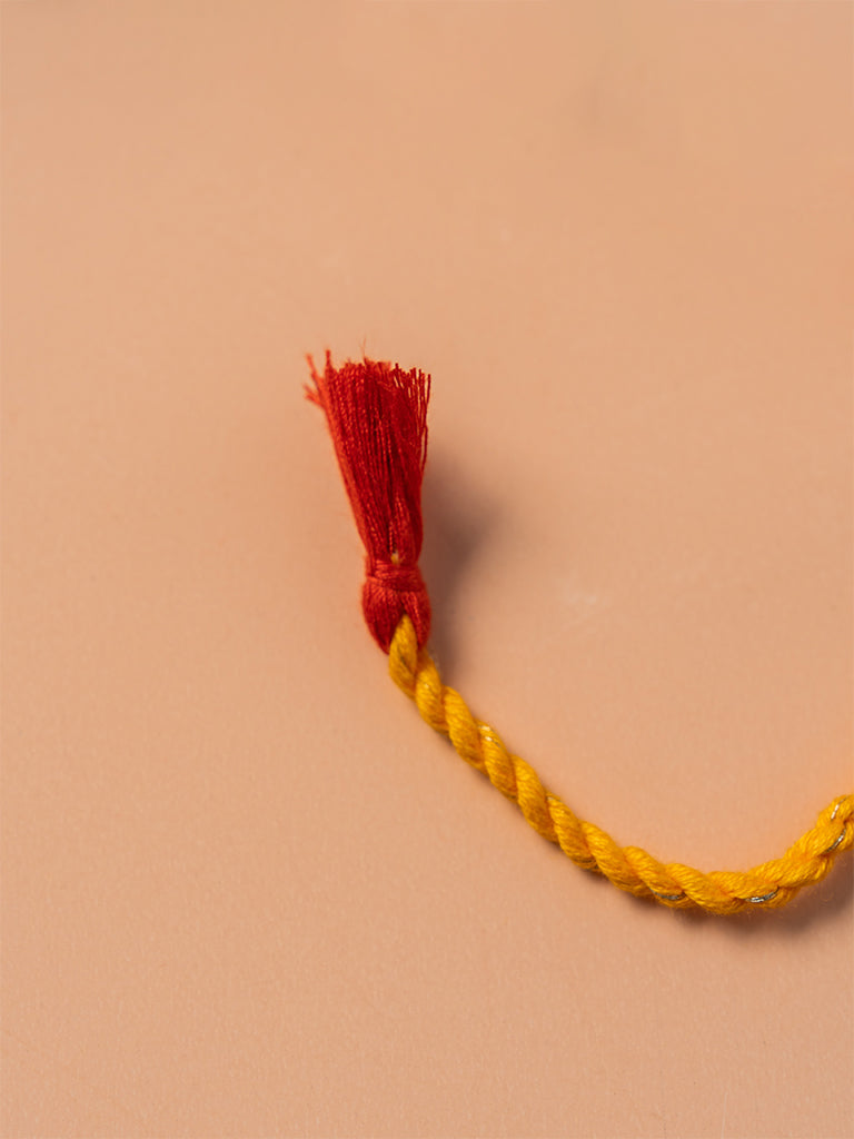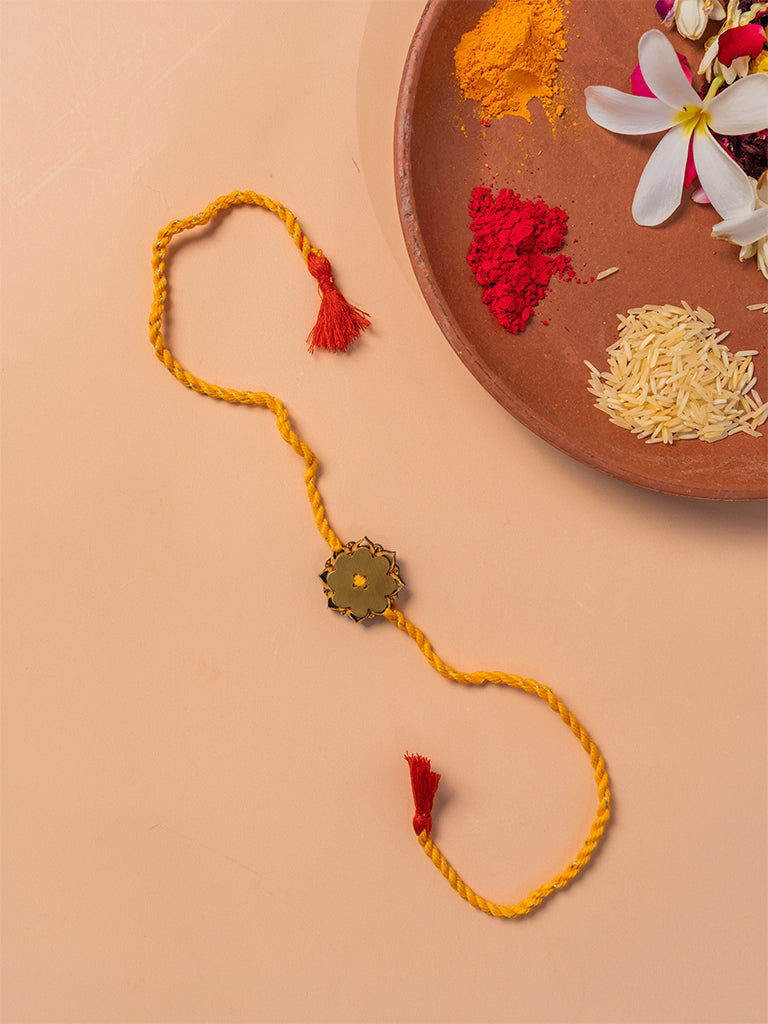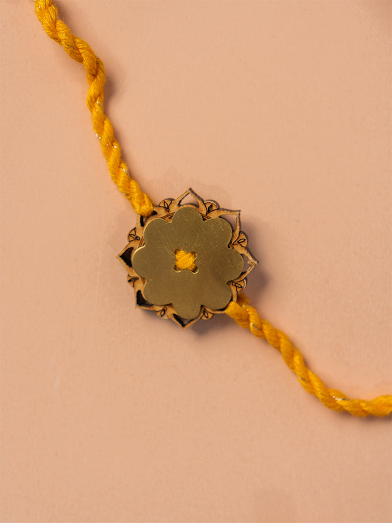 Admire the mandala brass Rakhi beautifully handcrafted using threads and wood. This yellow Rakhi is made out of soft beautiful threads and wood.