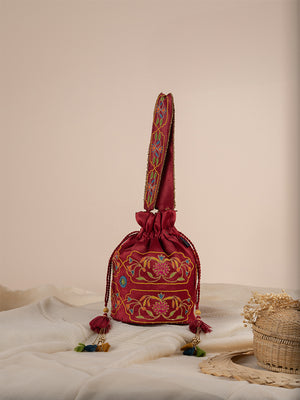 An exquisite maroon mashru potli is a symbol of true craftsmanship adorned with beads, mirrors, and zari embroidery. Embrace the absolute beauty of a circular floral round potli representing the essence of Gujarat.