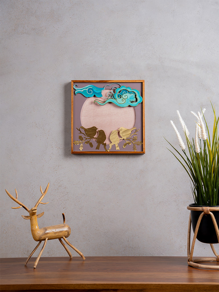 Delve in the playful metal bird composition-themed wall frame to elevate your home decor. An enchanting mashru fabric amplifies the look of the hand-cut metal objects. It is placed on MDF block. Also, fancy hand-painted brush strokes are an added element to the beauty of this frame.