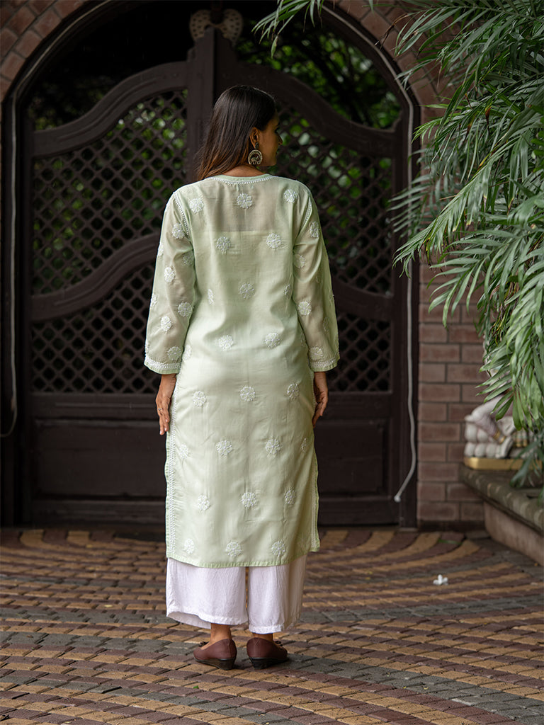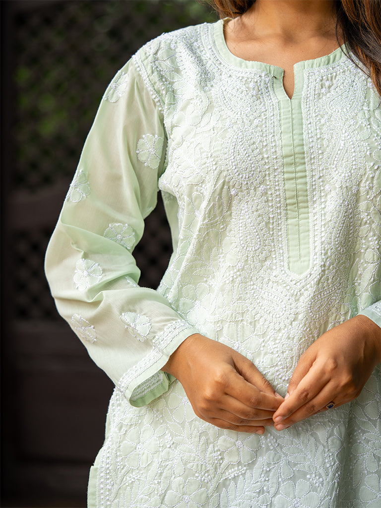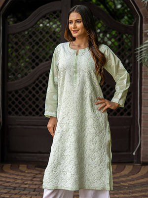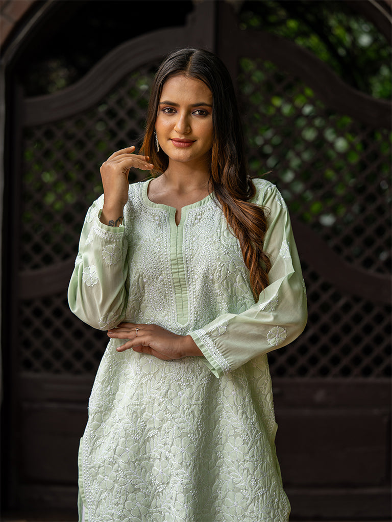 Introducing mint green floral kurta to add a touch of playfulness. This Chikankari long kurta is made from the soft cotton fabric to flaunt it as your sSumer escape.