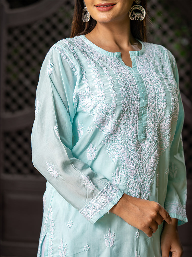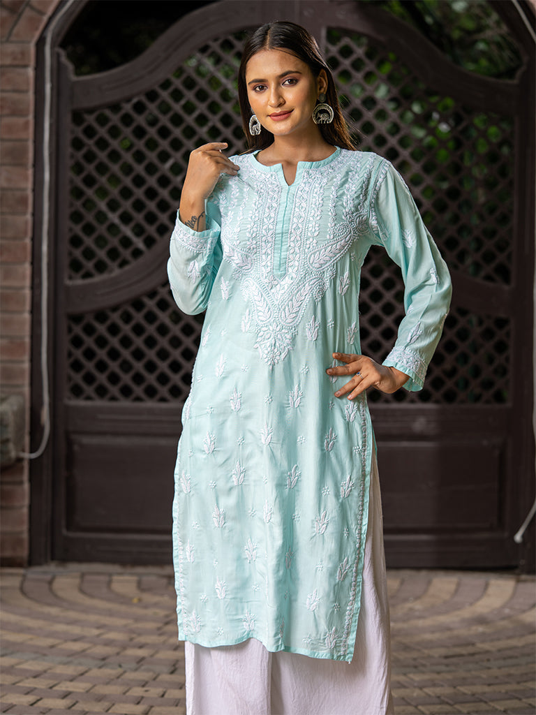 Embrace the timeless modal Lucknowi kurta designed in blue colour to add charm to its design. This Chikankari full-sleeves kurta is an appropriate choice for your solace.