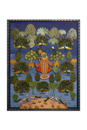 Mor Pichh Wall Frame – Blue (5x4 ft) Gaji Fabric with Painting, Badla Work & Feather Detailing